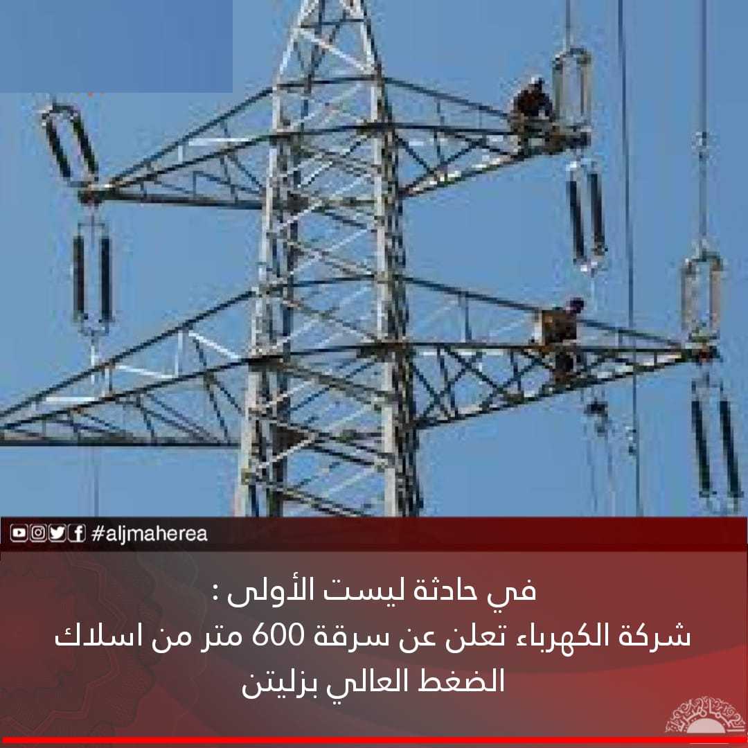 قالت الشركة العامة للكهرباء في بيان على صفحتها بشبكة التواصل الاجتماعي «فيسبوك» ان مجهولون قاموا بسرقة 600 متر من أسلاك الكهرباء على خط الشوين «ضغط عالي»، بمنطقة ماجر بإدارة توزيع زليتن.