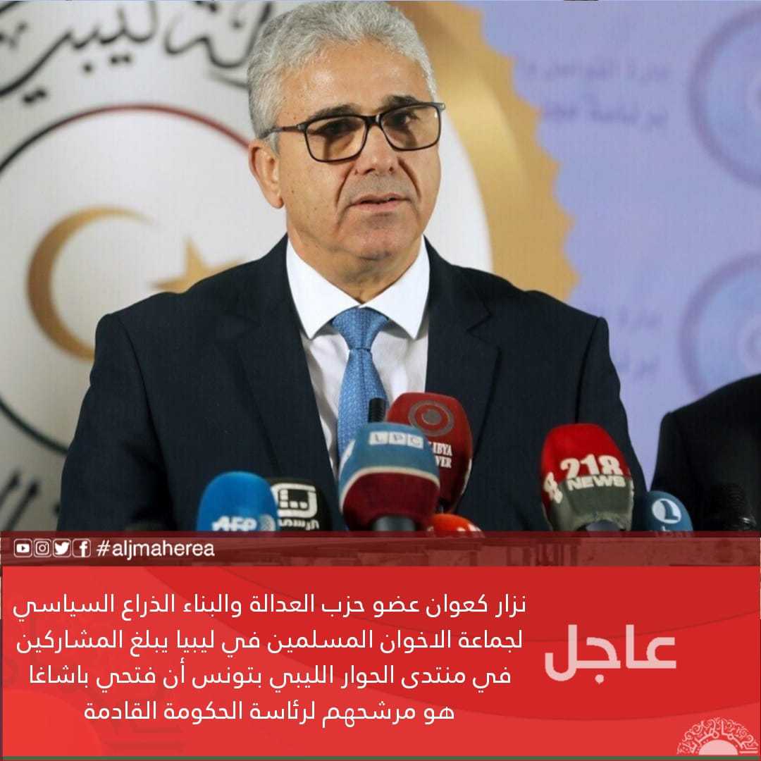 عاجل// نزار كعوان عضو حزب العدالة والبناء الذراع السياسي لجماعة الاخوان المسلمين في ليبيا يبلغ المشاركين في منتدى الحوار الليبي بتونس أن فتحي باشاغا هو مرشحهم لرئاسة الحكومة القادمة
