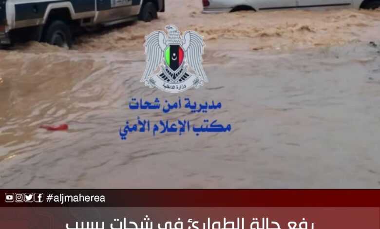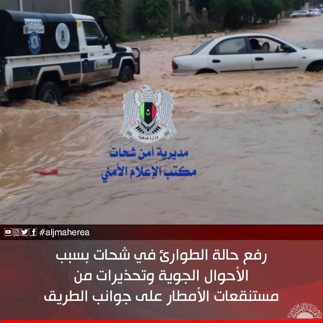 رفعت مديرية أمن شحات حالة الطوارئ في المدينة، وذلك لمواجة حالة عدم الاستقرار في الأحوال الجوية والسيول المحتملة.