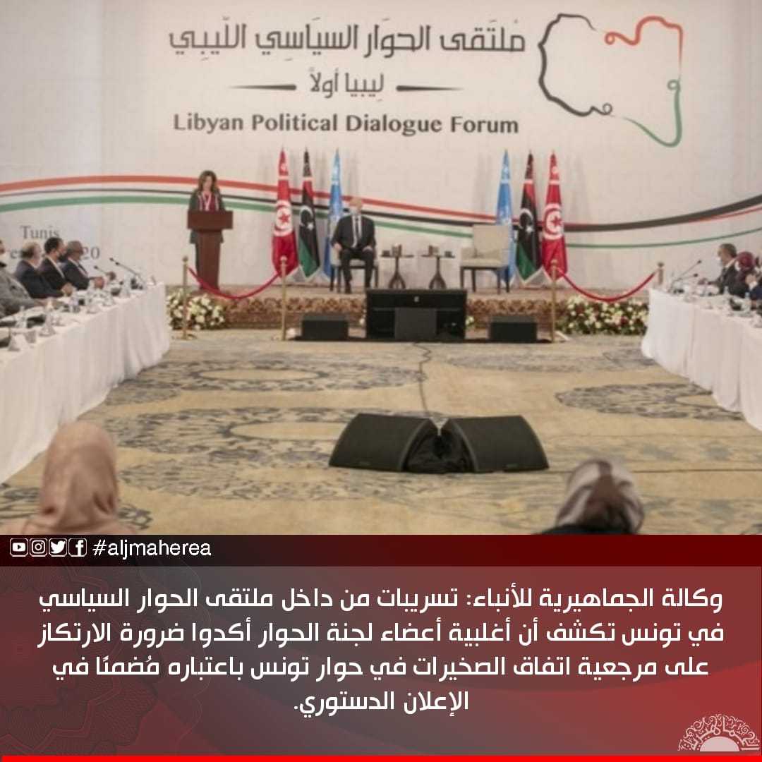 وكالة الجماهيرية للأنباء: تسريبات من داخل ملتقى الحوار السياسي في تونس تكشف أن أغلبية أعضاء لجنة الحوار أكدوا ضرورة الارتكاز على مرجعية اتفاق الصخيرات في حوار تونس باعتباره مُضمنًا في الإعلان الدستوري.