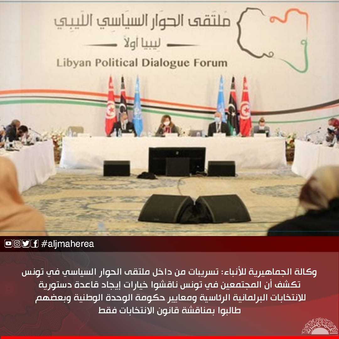 وكالة الجماهيرية للأنباء: تسريبات من داخل ملتقى الحوار السياسي في تونس تكشف أن المجتمعين في تونس ناقشوا خيارات إيجاد قاعدة دستورية للانتخابات البرلمانية الرئاسية ومعايير حكومة الوحدة الوطنية وبعضهم طالبوا بمناقشة قانون الانتخابات فقط