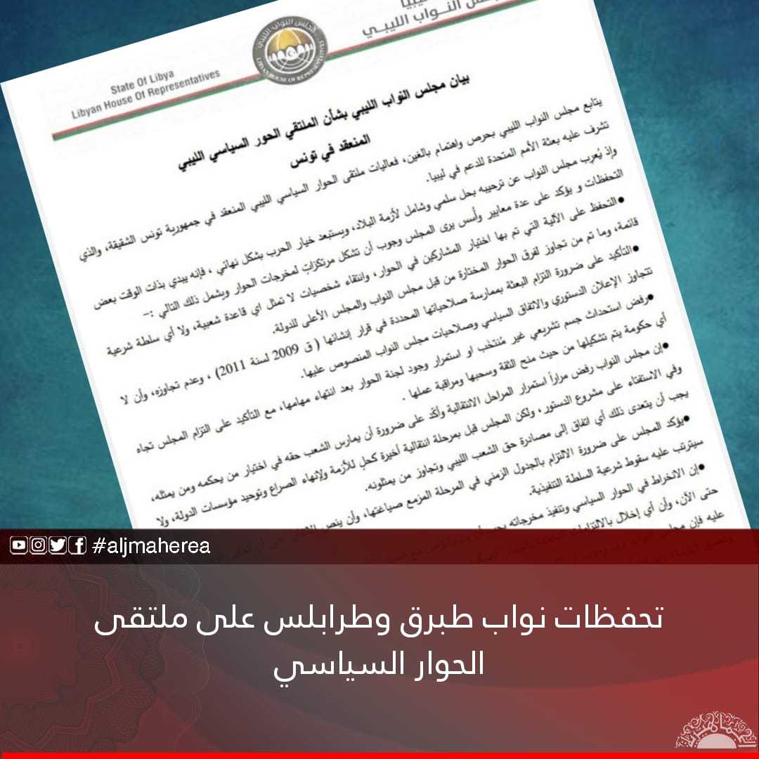 أصدر نحو 112 من أعضاء مجلس النواب بطبرق وآخرين من المقاطعين والمنشقين بطرابلس ،اليوم الثلاثاء ،بيان مشترك ،حمل عدّة تحفظات على ملتقى الحوار السياسي المنعقد في تونس ،خاصة حول شرعية وجود أعضاء و شخصيات لا تمثل أي قاعدة شعبية