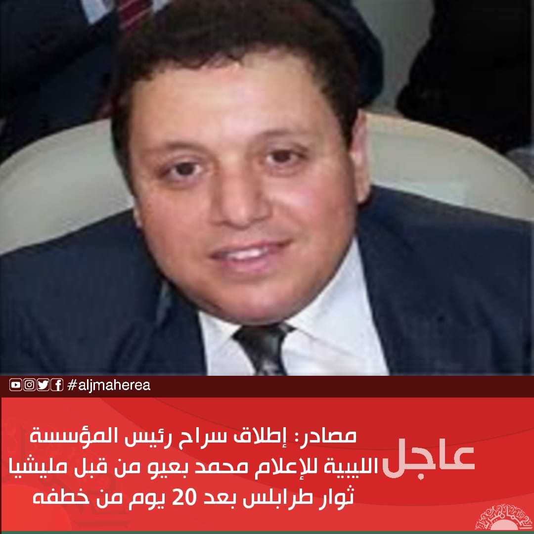 عاجل // مصادر: إطلاق سراح رئيس المؤسسة الليبية للإعلام محمد بعيو من قبل مليشيا ثوار طرابلس بعد 20 يوم من خطفه