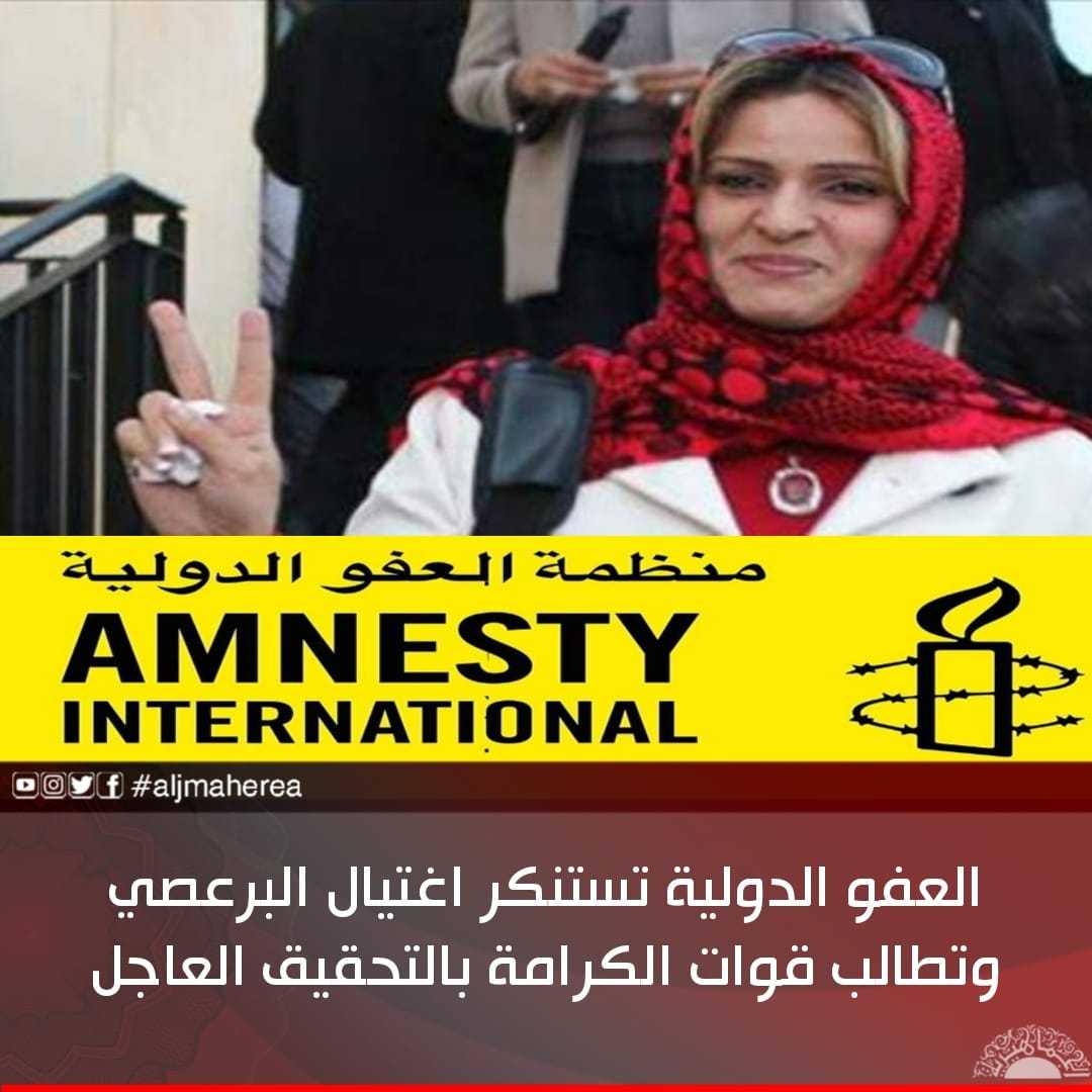 واعتبرت العفو الدولية، في عدة تغريدات على حسابها بموقع التواصل الاجتماعي “تويتر”، أن اغتيال البرعصي دليل على المخاطر التي تواجهها النساء في ليبيا، اللاتي يقمن بالحديث في أمور سياسية، ويواجهن موجة من الإساءات والتهديدات على مواقع التواصل الاجتماعي دون أي تحقيق.