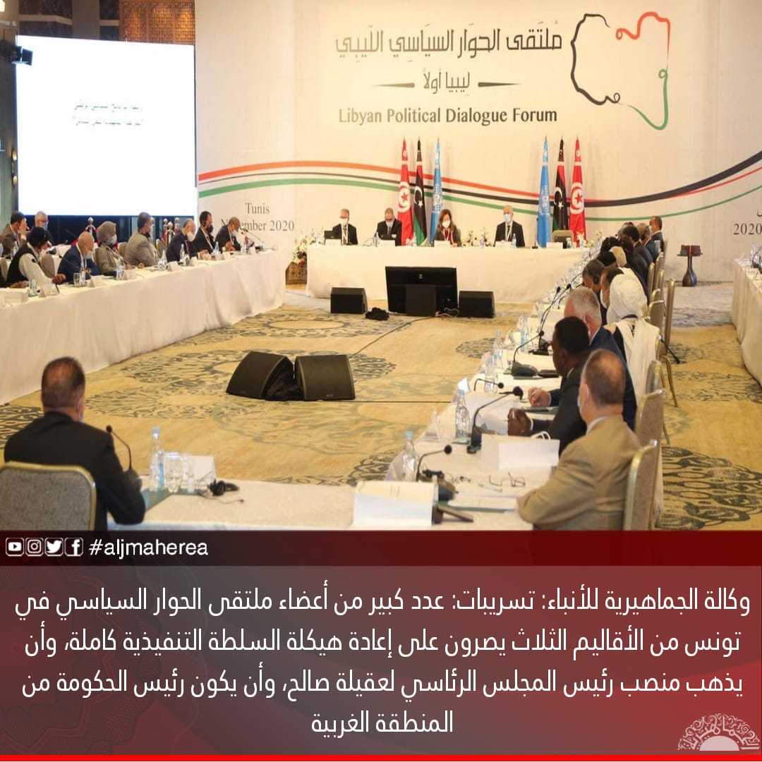 وكالة الجماهيرية للأنباء: تسريبات: عدد كبير من أعضاء ملتقى الحوار السياسي في تونس من الأقاليم الثلاث يصرون على إعادة هيكلة السلطة التنفيذية كاملة، وأن يذهب منصب رئيس المجلس الرئاسي لعقيلة صالح، وأن يكون رئيس الحكومة من المنطقة الغربية