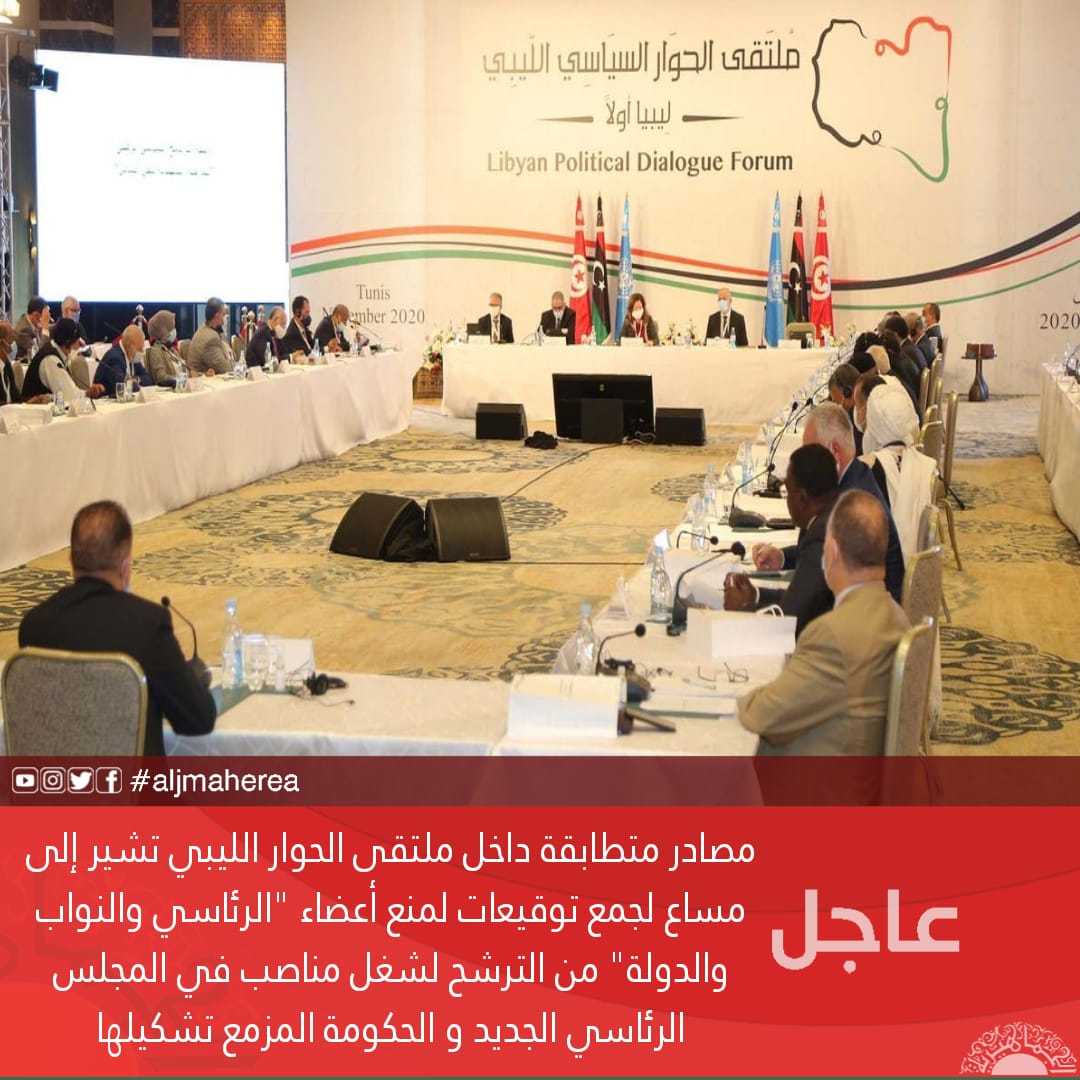 عاجل | مصادر متطابقة داخل ملتقى الحوار الليبي تشير إلى مساع لجمع توقيعات لمنع أعضاء “الرئاسي والنواب والدولة” من الترشح لشغل مناصب في المجلس الرئاسي الجديد و الحكومة المزمع تشكيلها