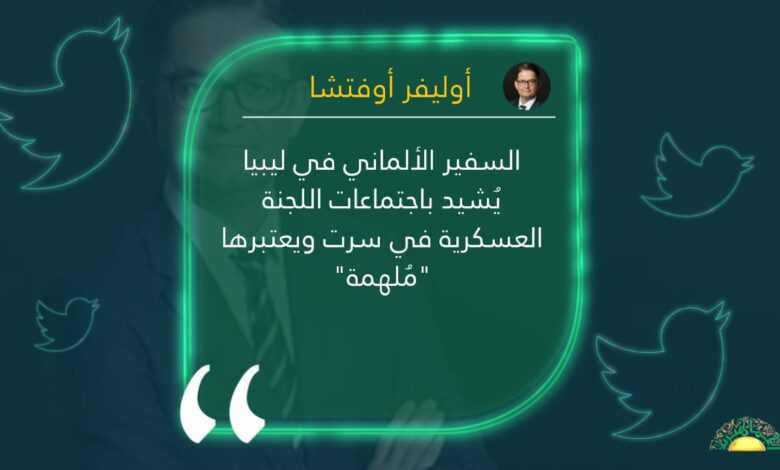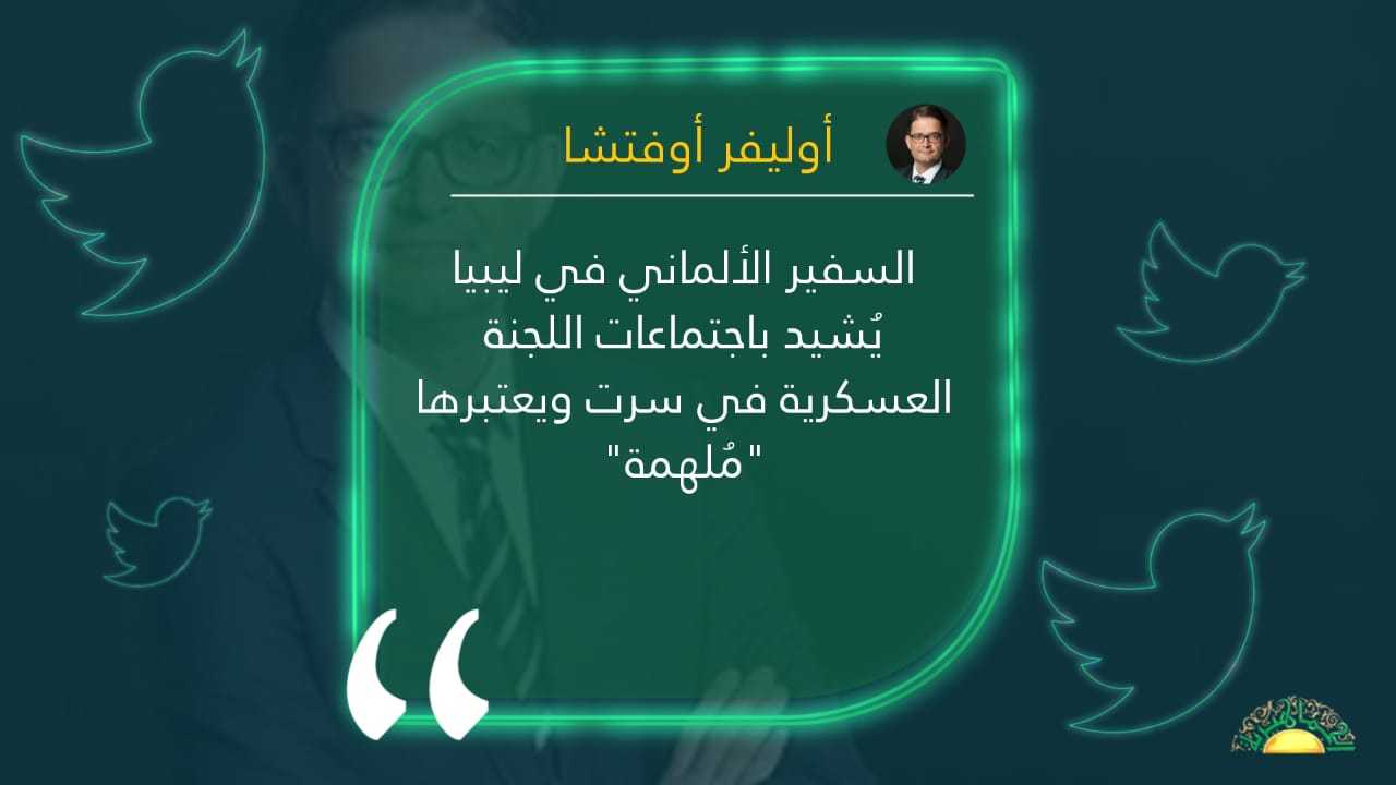 وكان السفير الألماني أعاد تغريدة نشرتها البعثة الأممية للاجتماع السادس للجنة العسكرية، قائلًا ” رمز ملهم للوحدة: ضباط عسكريون من كلا الطرفين يجتمعون في مدينة سرت لمواصلة مناقشة تنفيذ إتفاق جنيف لوقف إطلاق النار