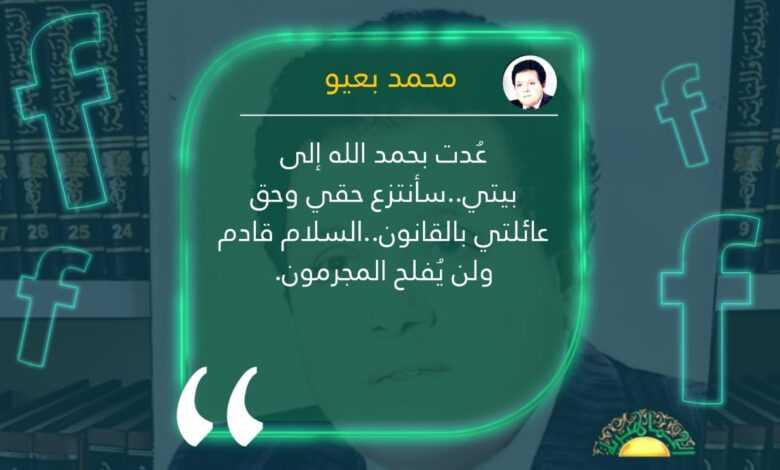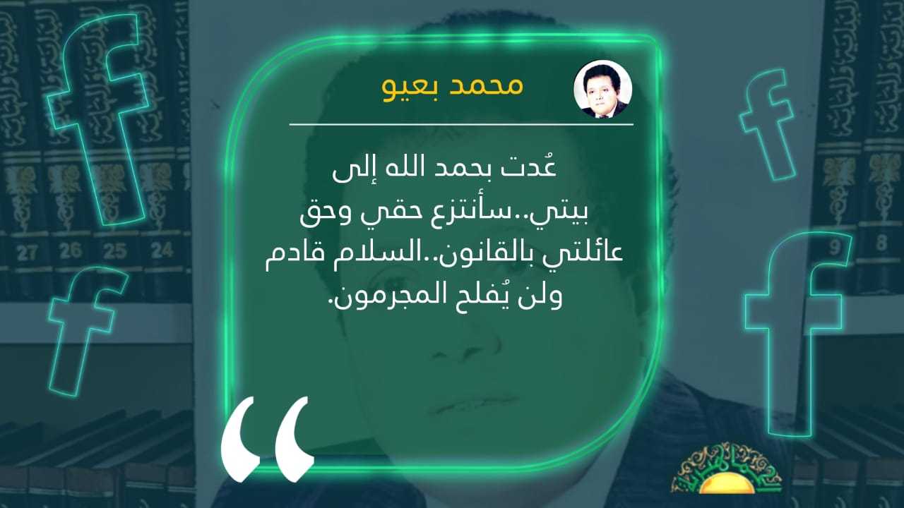 وكتب بعيو عبر صفحته الرسمية فيسبوك ” عُدت بحمد الله إلى بيتي..سأنتزع حقي وحق عائلتي بالقانون..السلام قادم ولن يُفلح المجرمون”.