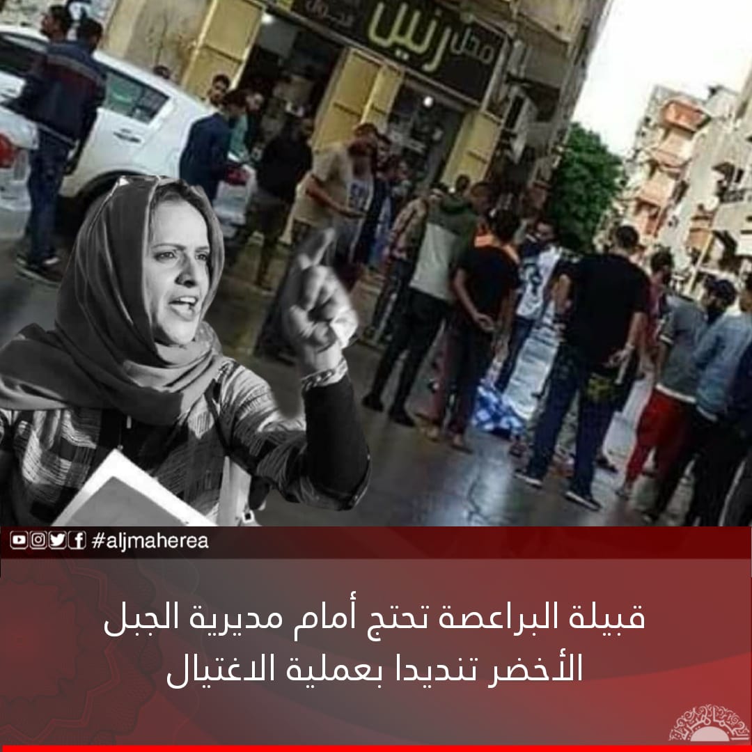 نظّم عدد من شباب قبيلة البراعصة وقفة احتجاجية أمام مديرية الجبل الأخضر بالبيضاء؛ تنديدا باغتيال ابنة عمومهم المحامية حنان البرعصي، في وضح النهار أمس الثلاثاء، ببنغازي على يد مسلحين مجهولين.