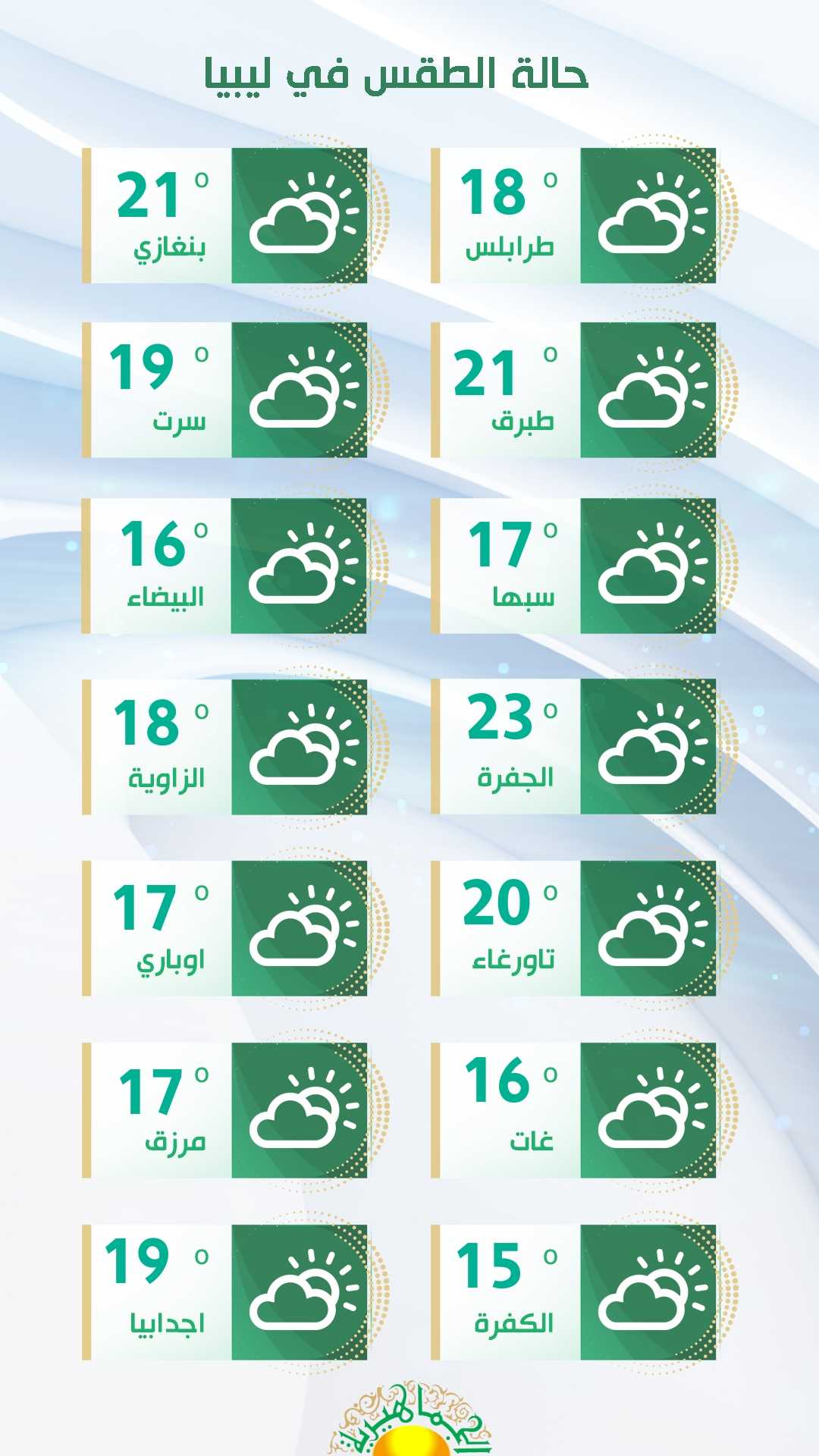 زخات خفيفة ومتفرقة متوقعة على الساحل الممتد من زواره إلى مصراتة وقد تتوغل مساءً ناحية الجفارة ومسلاته وترهونة والعربان وبني وليد.