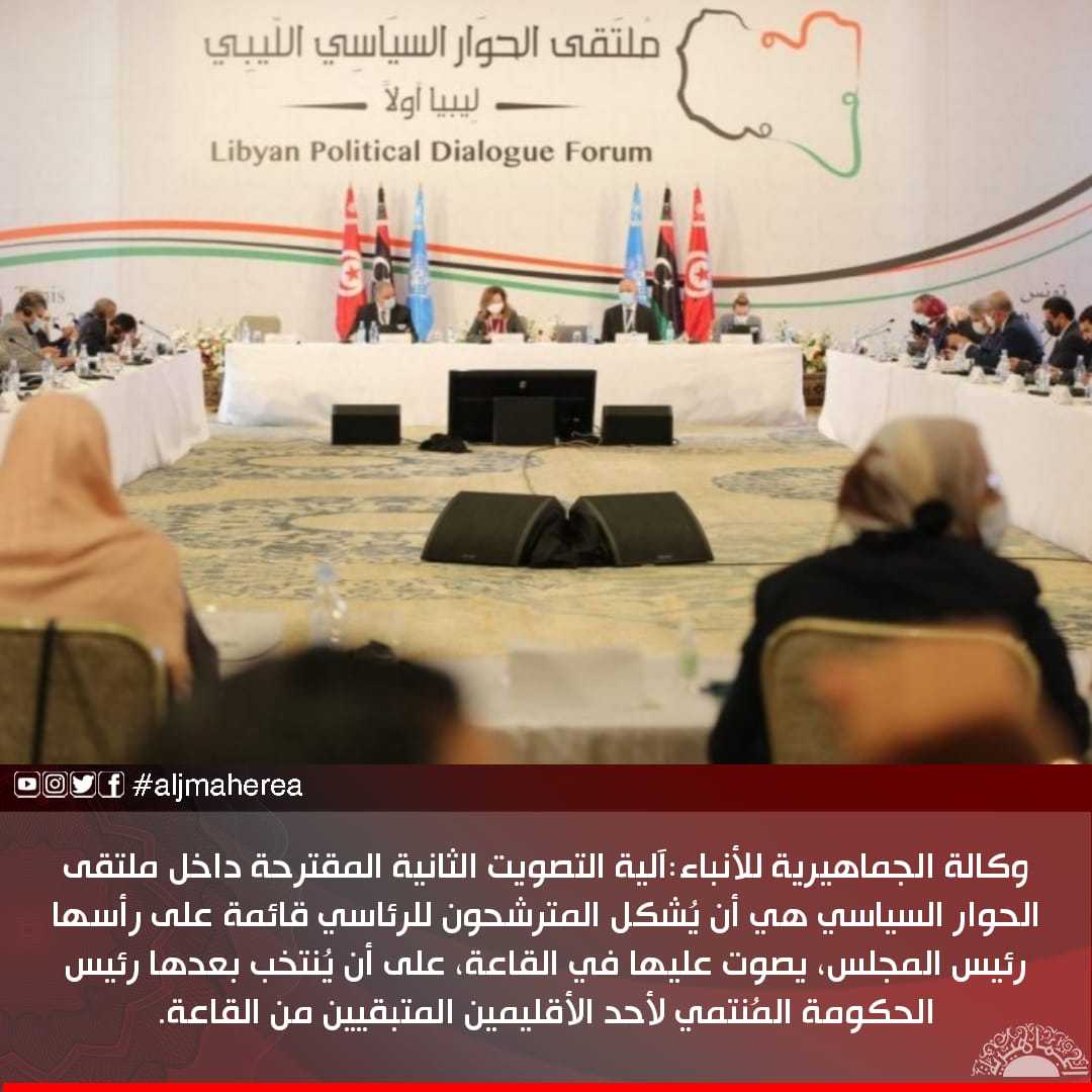 وكالة الجماهيرية للأنباء: آلية التصويت الثانية المقترحة داخل ملتقى الحوار السياسي هي أن يُشكل المترشحون للرئاسي قائمة على رأسها رئيس المجلس، يصوت عليها في القاعة، على أن يُنتخب بعدها رئيس الحكومة المُنتمي لأحد الأقليمين المتبقيين من القاعة