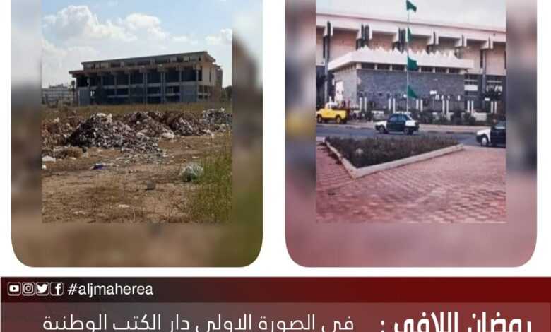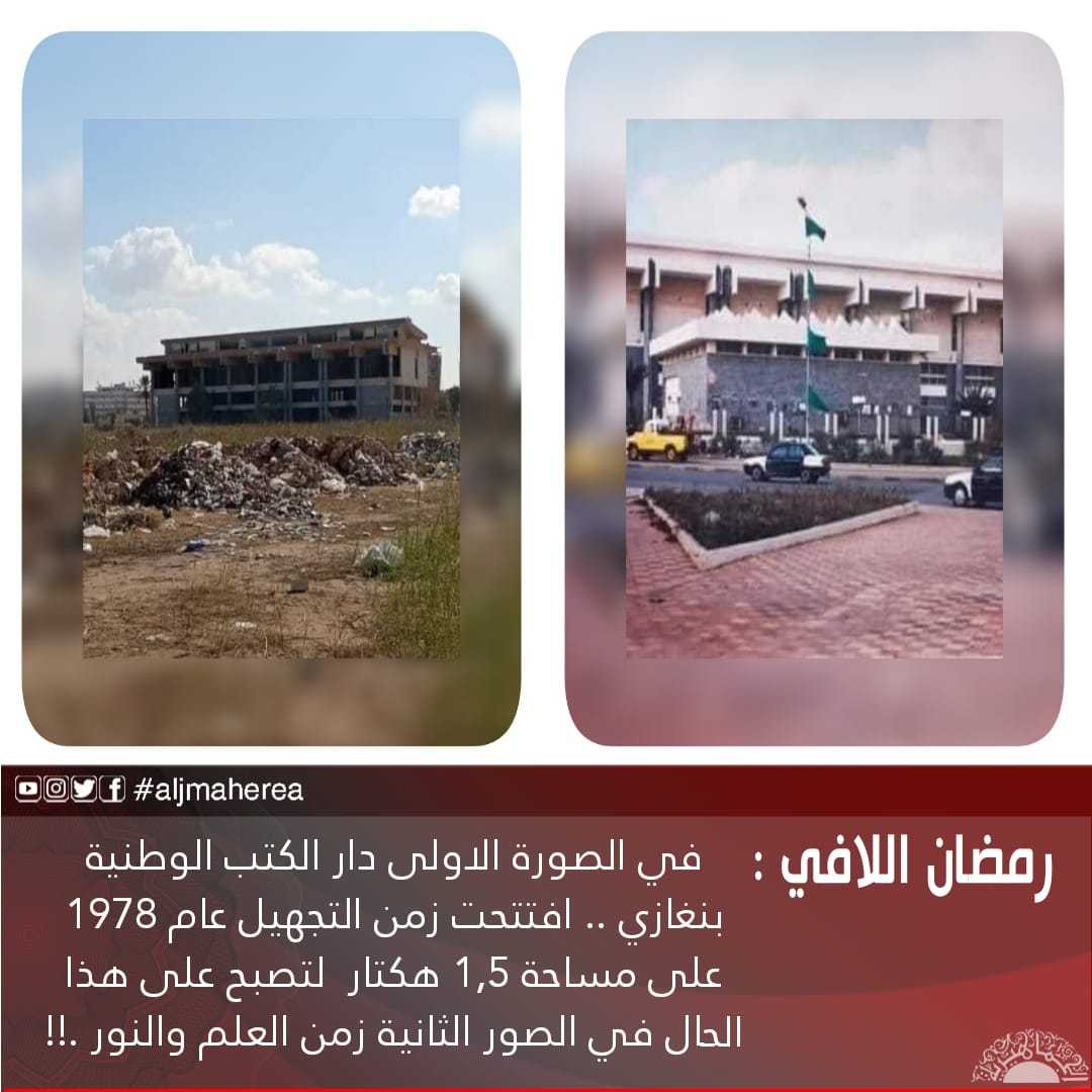 رمضان اللافي : في الصورة الاولى دار الكتب الوطنية بنغازي .. افتتحت زمن التجهيل عام 1978 على مساحة 1٫5 هكتار لتصبح على هذا الحال في الصور الثانية زمن العلم والنور .!!