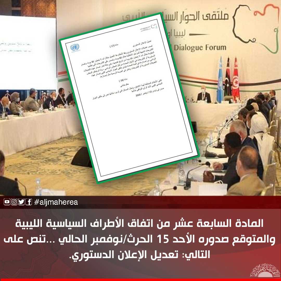 المادة السابعة عشر من اتفاق الأطراف السياسية الليبية والمتوقع صدوره الأحد 15 الحرث/نوفمبر الحالي …تنص على التالي: تعديل الإعلان الدستوري.