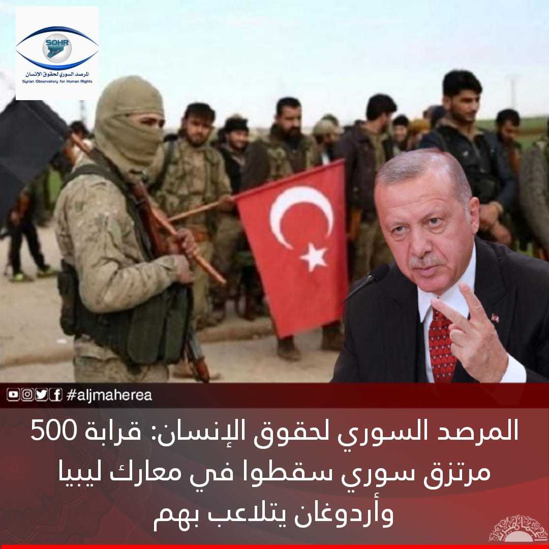 وأكد المرصد السوري لحقوق الانسان، أن أكثر من 789 مقاتلا من المرتزقة السوريين الموالين لأنقرة، قتلوا في معارك ليبيا، وإقليم قره باغ، منهم 496 في ليبيا و293 في قره باغ، فضلاً عن إصابة وفقدان الاتصال بالمئات منهم، بعد أن حولتهم المخابرات التركية إلى مرتزقة، في استغلال ولاء تلك الفصائل الكامل لتركيا بالإضافة للإغراء المادي.