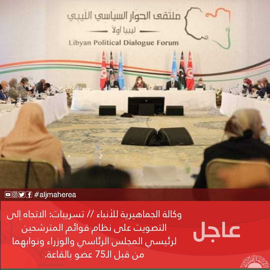 عاجل | وكالة الجماهيرية للأنباء // تسريبات: الاتجاه إلى التصويت على نظام قوائم المترشحين لرئيسي المجلس الرئاسي والوزراء ونوابهما من قبل الـ75 عضو بالقاعة