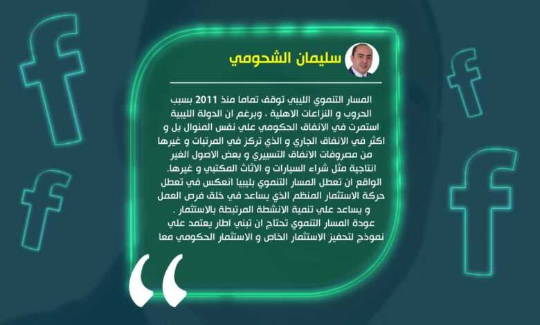 قال الخبير الاقتصادي سليمان الشحومي إن المسار التنموي الليبي توقف تماما منذ 2011 بسبب الحروب و النزاعات الاهلية.