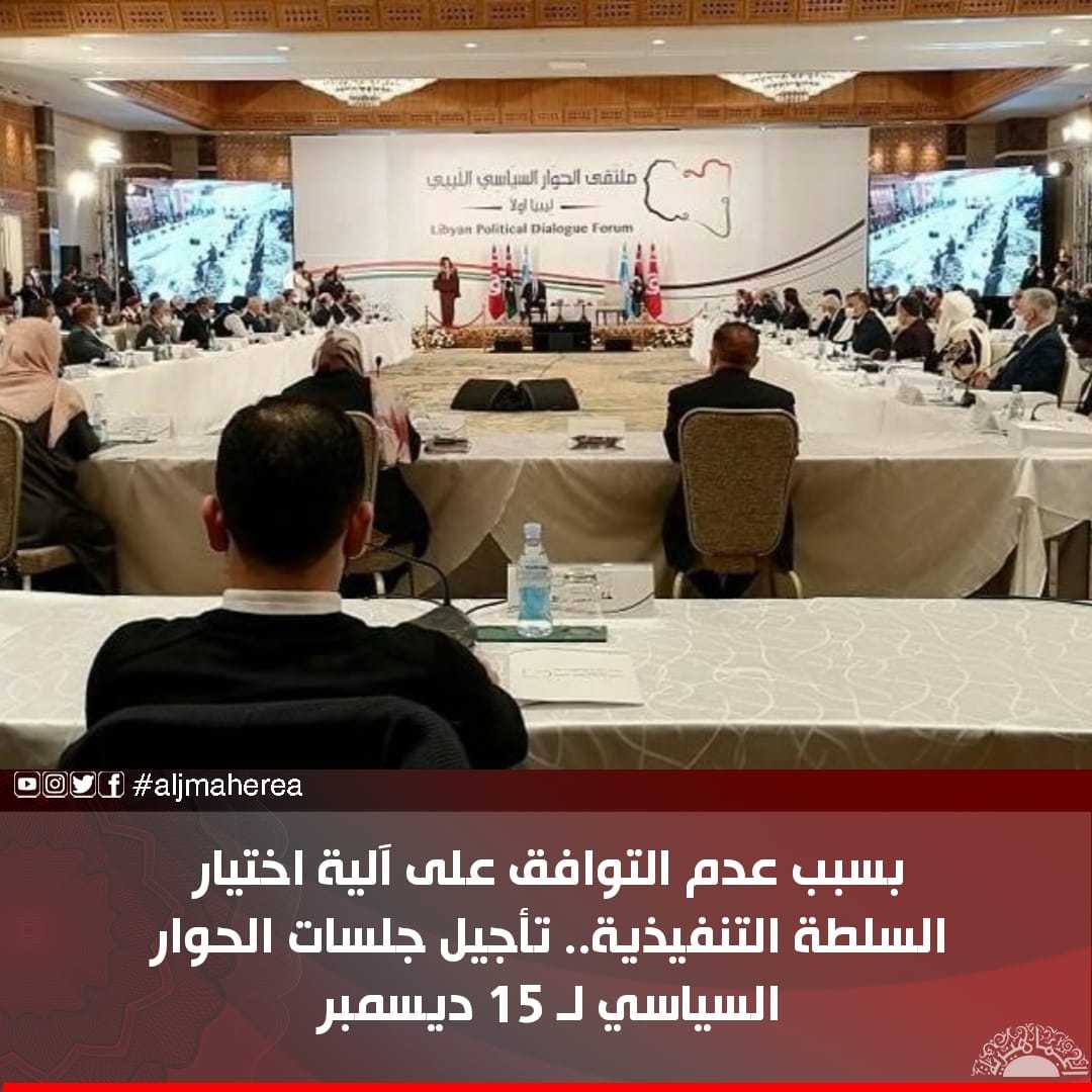 تأجلت جلسات الحوار السياسي إلى يوم 15 ديسمبر القادم، وذلك بسبب عدم توافق الأطراف حول آلية اختيار السلطة التنفيذية الجديدة.