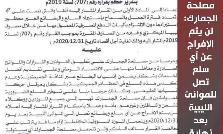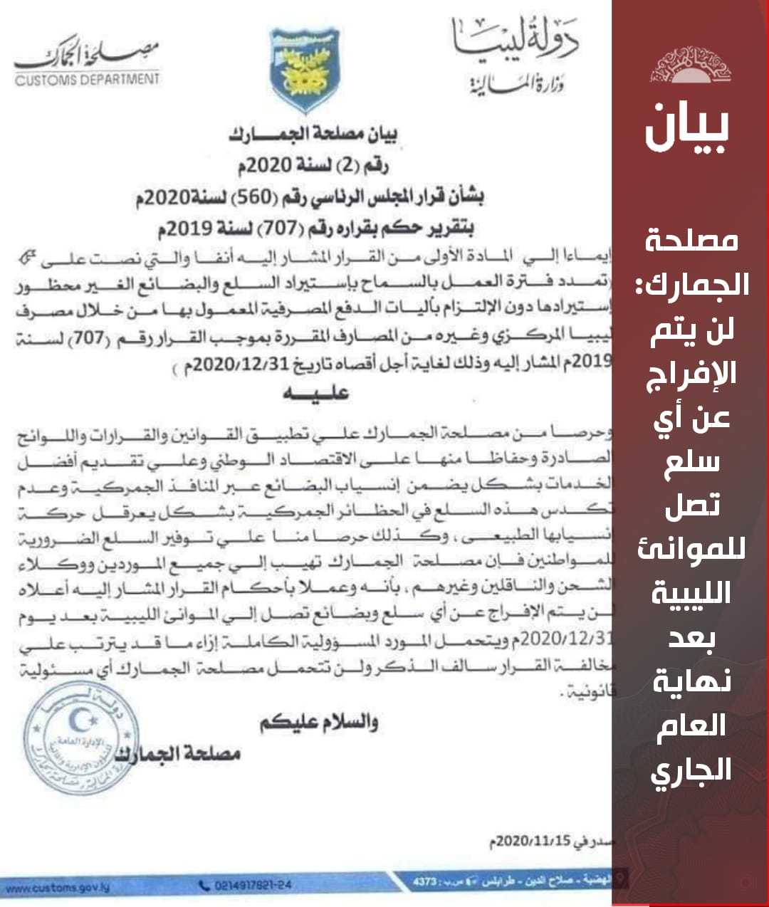 أعلنت مصلحة الجمارك أنه لن يتم الإفراج عن أي سلع وبضائع تصل إلى الموانئ الليبية بعد يوم 31/ 12/ 2020 ويتحمل المورد المسؤولية الكاملة إزاء ما قد يترتب على مخالفة القرار ، ولن تتحمل مصلحة الجمارك أي مسؤولية قانونية.