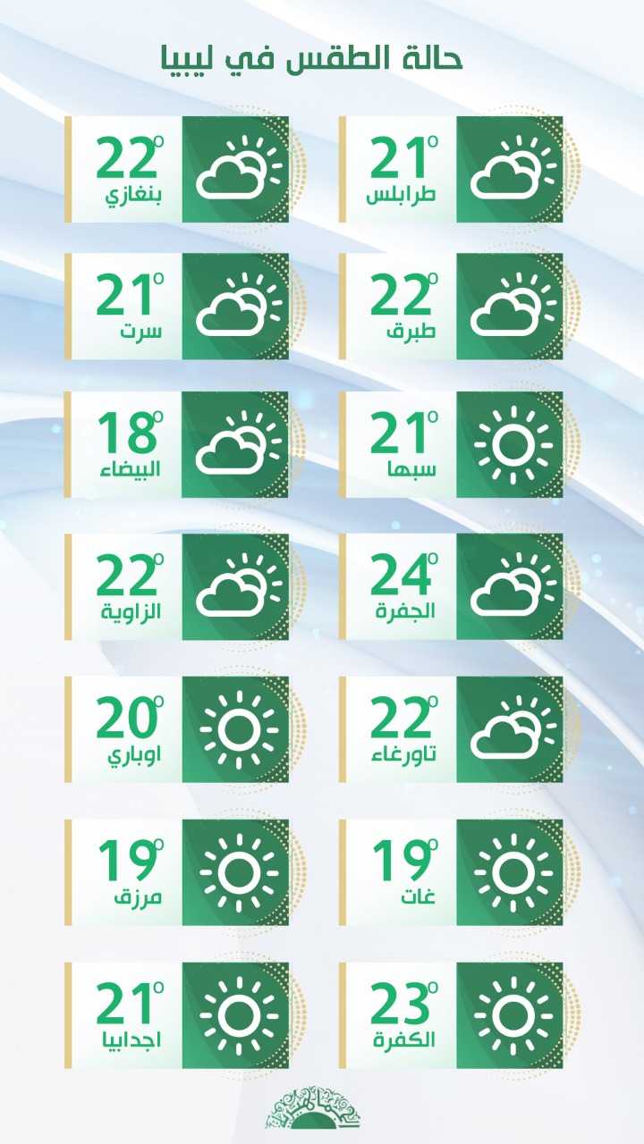 السماء مغطاة جزئيًّا بالسحب، تتكاثر أحيانًا على بعض مناطق الجبل الأخضر، مع سقوط أمطار خفيفة، وتكون الفرصة مهيأة لسقوط أمطار جيدة بدءًا من يوم الخميس، بينما تتراوح درجات الحرارة القصوى بين 21 و24 درجة مئوية، ولا تتجاوز 19 درجة مئوية على مناطق الجبل الأخضر.