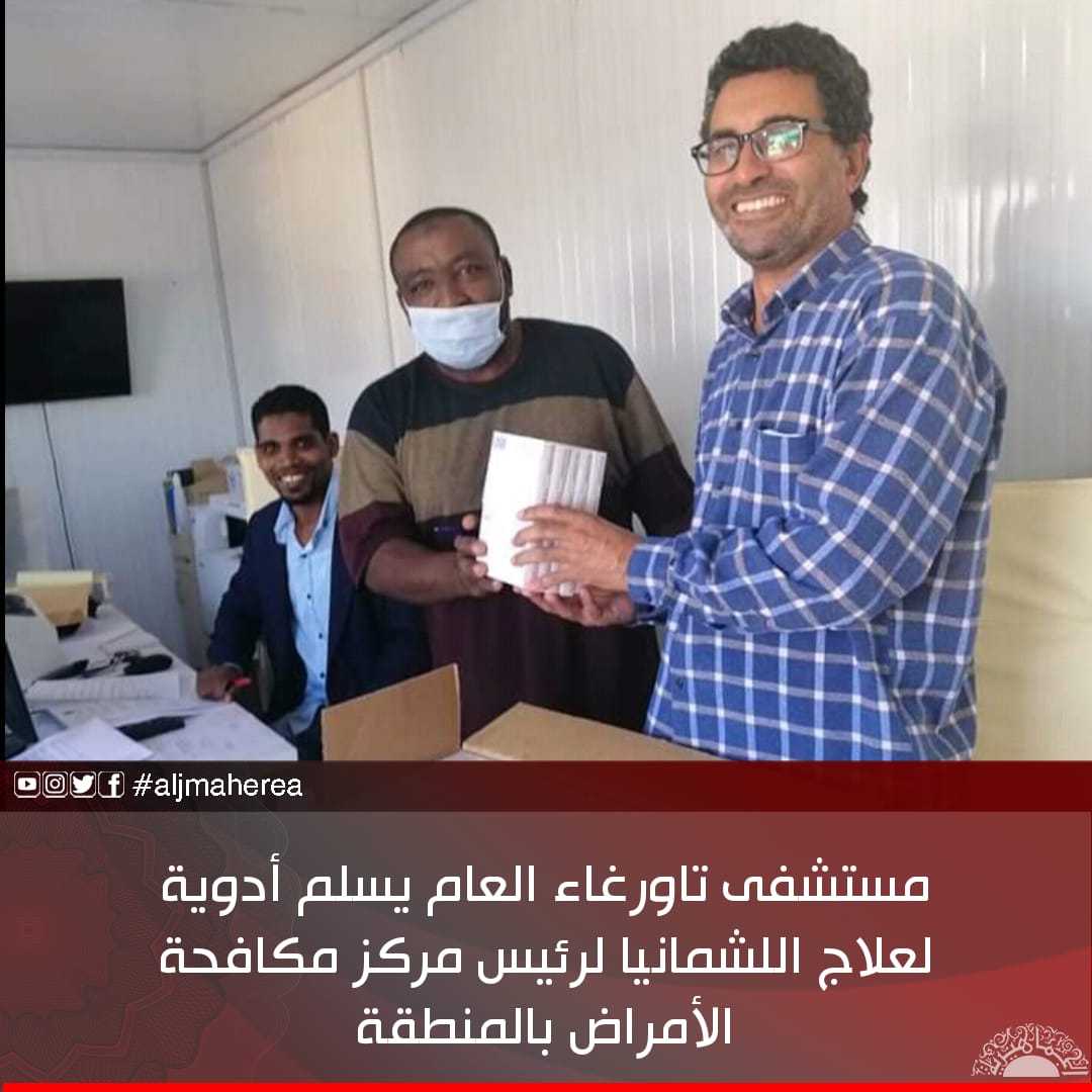 سلّم مدير عام مستشفى تاورغاء العام الدكتور محمد إدريس أدوية خاصة بمرض اللشمانيا إلى رئيس مركز مكافحة الأمراض فرع تاورغاء المهندس على سعد.
