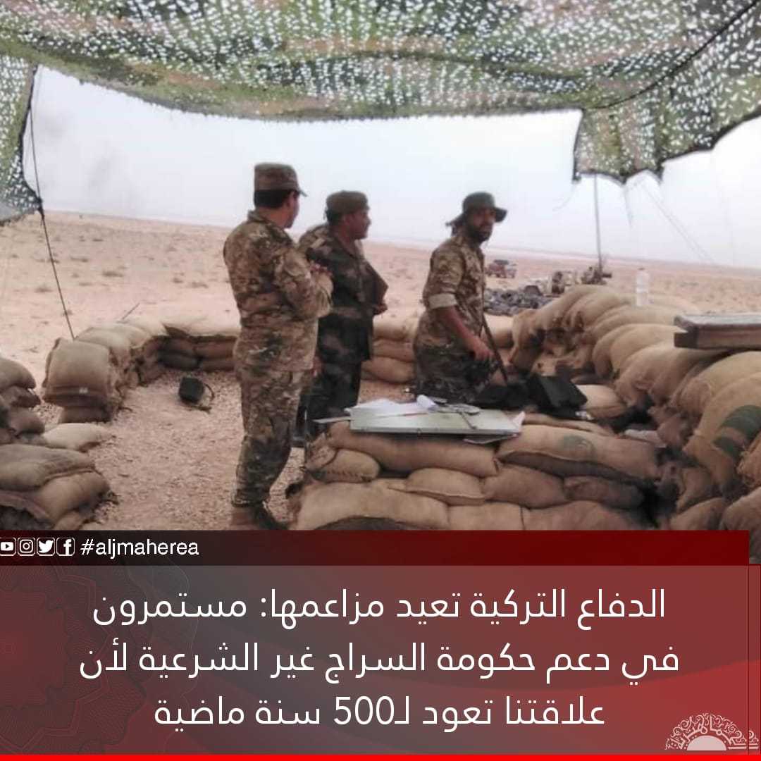 استمرارا للمزاعم التي دأبت حكومة أردوغان على ترديدها، بشأن أسباب تدخلها في ليبيا، ومساندتها لحكومة السراج غير الشرعية، أكدت وزارة الدفاع التركية، مواصلة دعمها لحكومة السراج غير الشرعية، قائلة إن ذلك يستند إلى 500 سنة من العلاقات المشتركة.