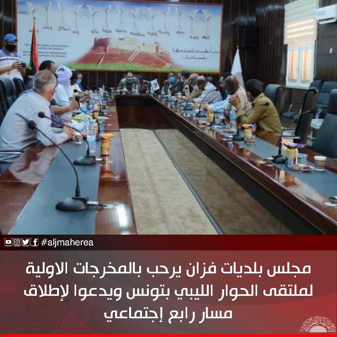 رحب مجلس بلديات فزان بالمخرجات الاولية لملتقى الحوار الليبي بتونس خصوصا التوافق على الذهاب نحو إنهاء أزمة تعدد الشرعيات بإجراء انتخابات رئاسية وبرلمانية نهاية العام المقبل .