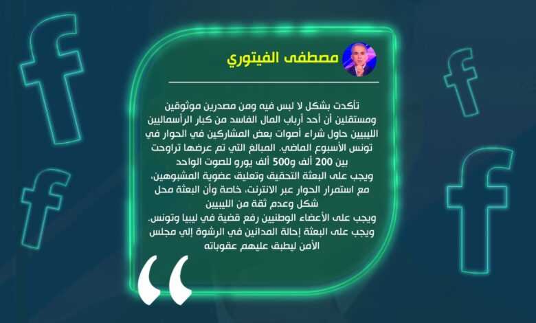 وقال الفيتوري في مقال نشره بعنوان “حوار الرشوة والتدجيل”، عبر صفحته على موقع التواصل الاجتماعي فيسبوك، “تأكدت بشكل لا لبس فيه ومن مصدرين موثوقين ومستقلين أن أحد أرباب المال الفاسد من كبار الرأسماليين الليبيين حاول شراء أصوات بعض المشاركين في الحوار في تونس الأسبوع الماضي، وأن المبالغ التي تم عرضها تراوحت بين 200 ألف و500 ألف يورو للصوت الواحد.”