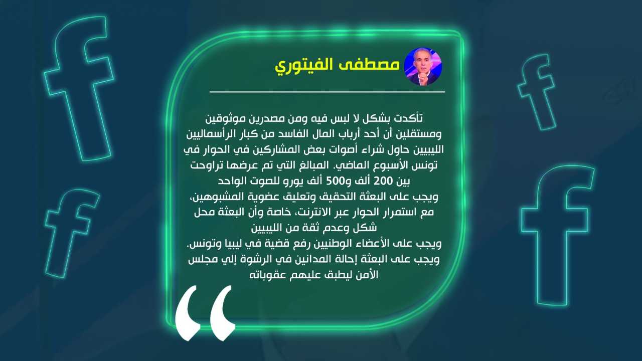 أكد الكاتب الصحفي مصطفى الفيتوري، وجود محاولات من أرباب المال الفاسد، حاولوا شراء أصوات بعض المشاركين في الحوار بتونس.