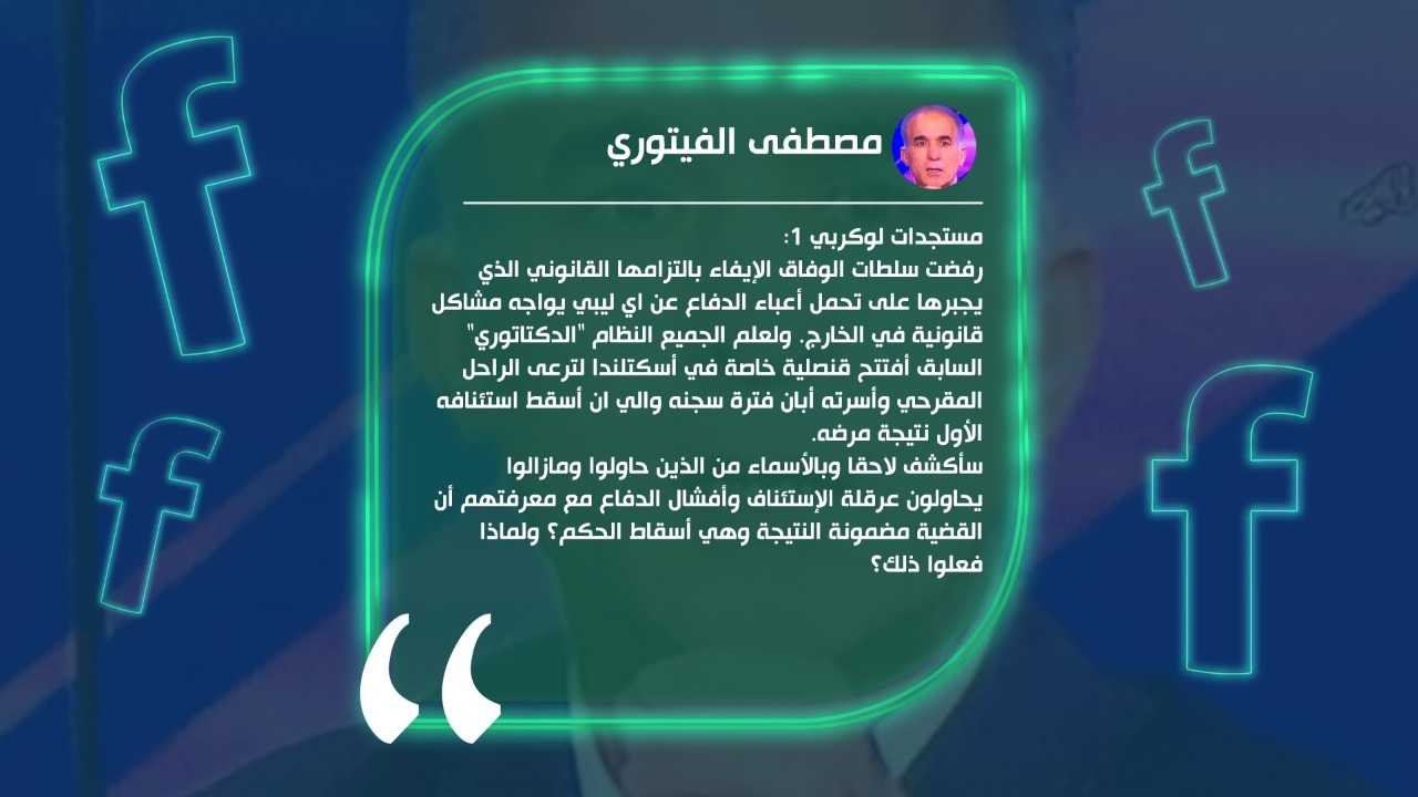 وأشار إلى أن “سلطات الوفاق رفضت الإيفاء بالتزامها القانوني الذي يجبرها على تحمل أعباء الدفاع عن اي ليبي يواجه مشاكل قانونية في الخارج. ولعلم الجميع النظام “الدكتاتوري” السابق أفتتح قنصلية خاصة في أسكتلندا لترعى الراحل المقرحي وأسرته أبان فترة سجنه والي ان أسقط استئنافه الأول نتيجة مرضه”.