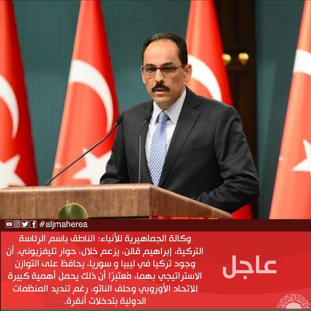 عاجل // وكالة الجماهيرية للأنباء: الناطق باسم الرئاسة التركية، إبراهيم قالن، يزعم خلال، حوار تليفزيوني، أن وجود تركيا في ليبيا و سوريا، يحافظ على التوازن الاستراتيجي بهما، مُعتبرًا أن ذلك يحمل أهمية كبيرة للاتحاد الأوروبي وحلف الناتو، رغم تنديد المنظمات الدولية بتدخلات أنقرة.