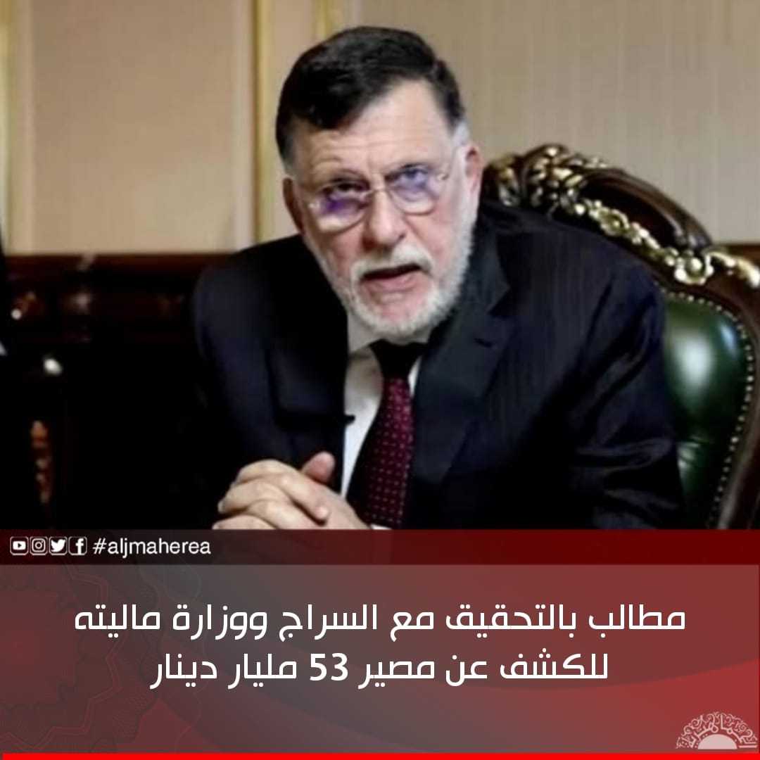 طالب الخبير الاقتصادي، أبو بكر الطور، بتشكيل لجان تحقيق مع فائز السراج ووزارة المالية بحكومته، للكشف عن مصير 53 مليار دينار ليبي دخلت إلى خزينة الدولة، وفق قوله.
