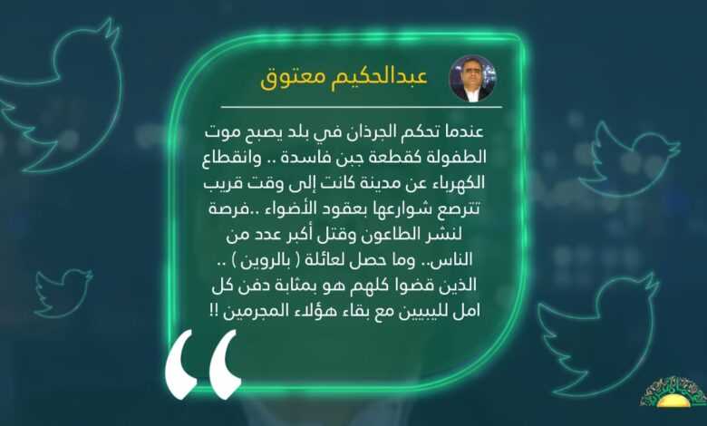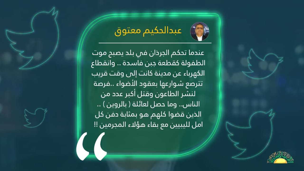 عندما تحكم الجرذان في بلد يصبح موت الطفولة كقطعة جبن فاسدة .. وانقطاع الكهرباء عن مدينة كانت إلى وقت قريب تترصع شوارعها بعقود الأضواء ..فرصة لنشر الطاعون وقتل أكبر عدد من الناس.. وما حصل لعائلة ( بالروين ) .. الذين قضوا كلهم هو بمثابة دفن كل امل لليبيين مع بقاء هؤلاء المجرمين !!