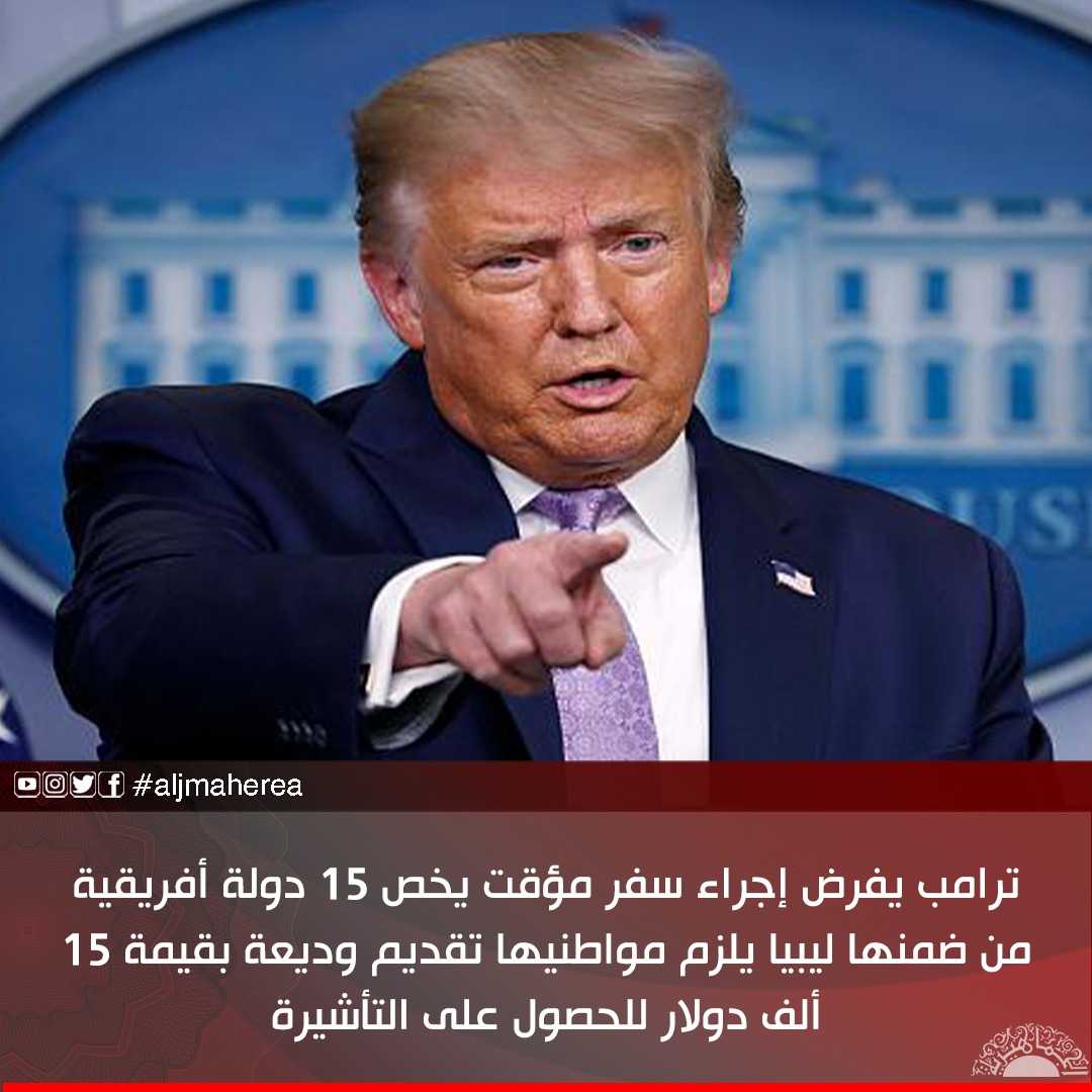 فرضت إدارة الرئيس الأميركي المنتهية ولايته، دونالد ترامب إجراء سفر مؤقت يخص 15 دولة أفريقية من ضمنها ليبيا يلزم القادمين منها تقديم وديعة بقيمة 15 ألف دولار للحصول على تأشيرة زيارة الولايات المتحدة بهدف العمل أو الترفيه.