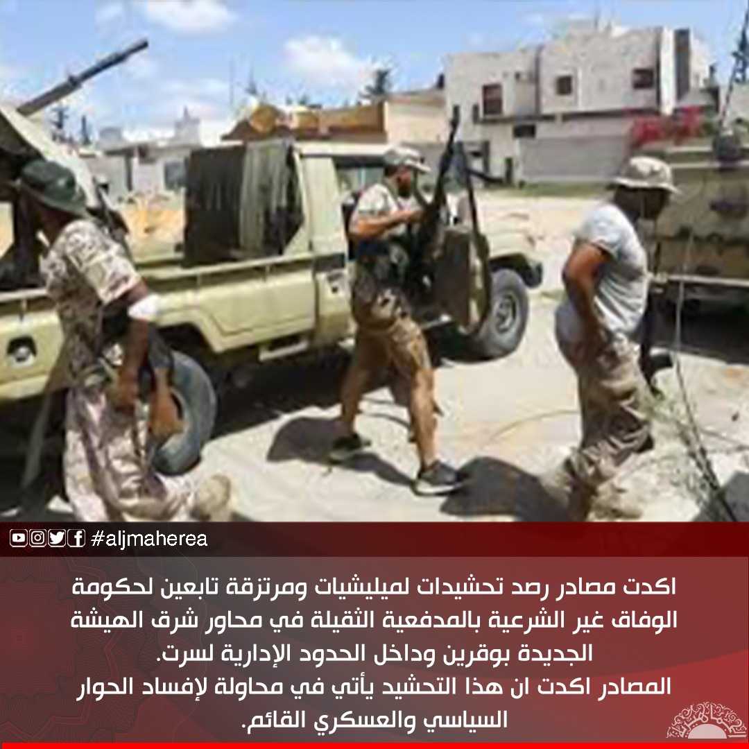 اكدت مصادر رصد تحشيدات لميليشيات ومرتزقة تابعين لحكومة الوفاق غير الشرعية بالمدفعية الثقيلة في محاور شرق الهيشة الجديدة بوقرين وداخل الحدود الإدارية لسرت. المصادر اكدت ان هذا التحشيد يأتي في محاولة لإفساد الحوار السياسي والعسكري القائم.