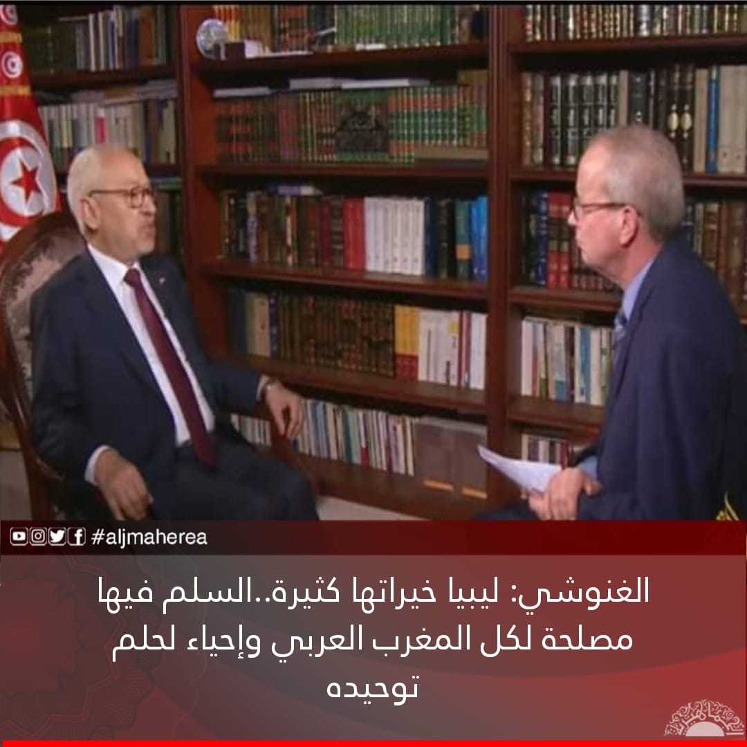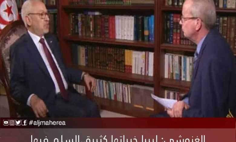 ورأى الغنوشي، في لقاء تلفزيوني تابعته قناة “الجماهيرية” عبر قناة “الجزيرة” القطرية، الأربعاء، أن استتباب السلم في ليبيا ليس مصلحة ليبية فقط، متابعا: “هذا البلد حباه الله بخيرات كثيرة، لا يحتاج إلا إلى السلم حتى يتمتع أهله بخيراته ويفيئوا على كل المنطقة”