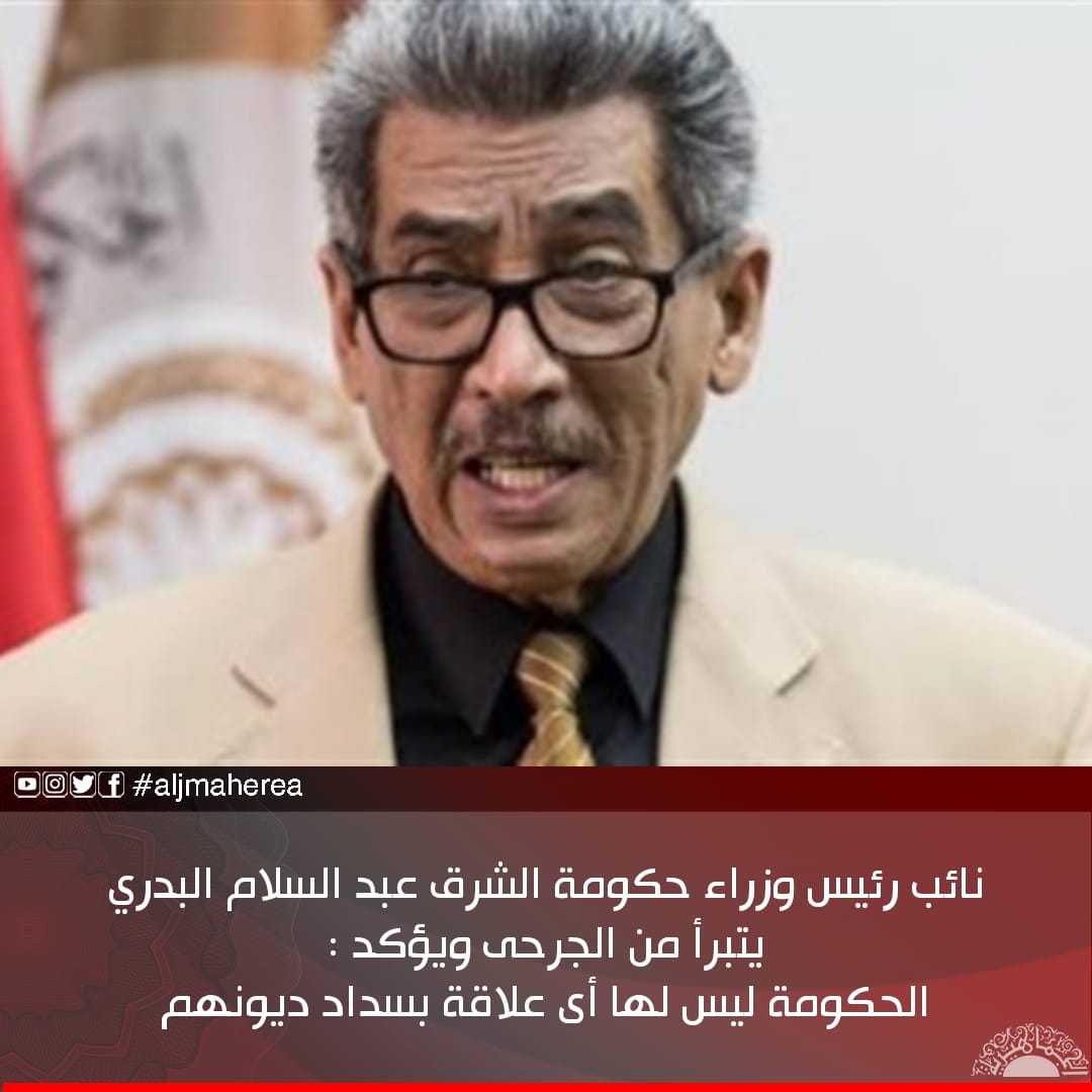 تبرأ نائب رئيس مجلس الوزراء بحكومة الشرق، عبد السلام البدري، من الجرحى مؤكدا إن الحكومة ليس لها أى علاقة بسداد ديونهم .