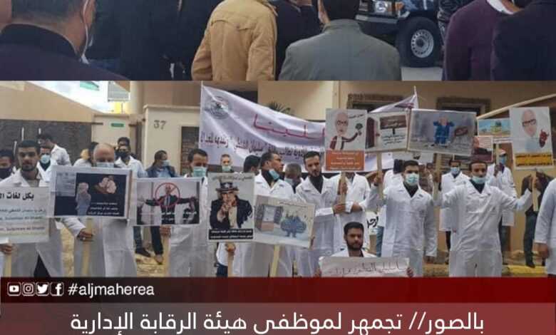 بالصور// تجمهر لموظفي هيئة الرقابة الإدارية ومركزالرقابة على الأدوية والأغذية ومطالبات بإقالة أسامة الشنطي وسرعة صرف المرتبات من أمام مبنى برلمان طرابلس في زاوية الدهماني