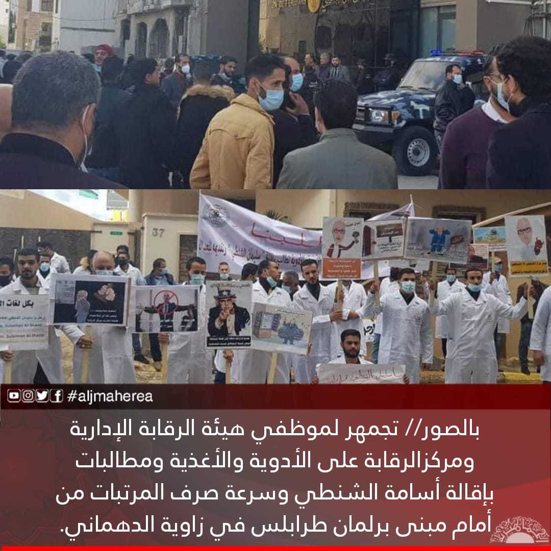 بالصور// تجمهر لموظفي هيئة الرقابة الإدارية ومركزالرقابة على الأدوية والأغذية ومطالبات بإقالة أسامة الشنطي وسرعة صرف المرتبات من أمام مبنى برلمان طرابلس في زاوية الدهماني