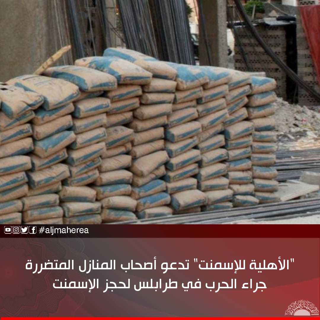 دعت الشركة الأهلية للإسمنت المساهمة، المواطنين الذين تضررت منازلهم بسبب الحرب في جنوب طرابلس، والراغبين في حجز 300 كغم من الإسمنت لصيانة منازلهم، بتقديم المستندات المطلوبة.