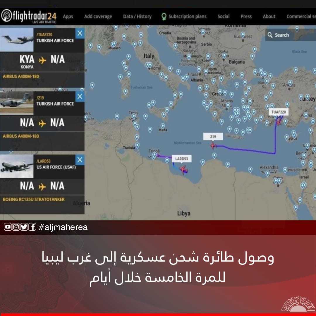 وأظهرت حركة الملاحة الجوية وصول الطائرة إلى غرب ليبيا، قادمة من قاعدة قيصري الجوية العسكرية في قونيا التابعة لتركيا، لتكون الخامسة على مدار 4 أيام.