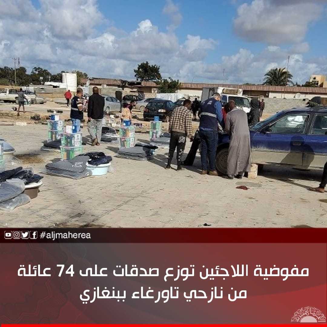 وزعت المفوضية السامية لشؤون اللاجئين في ليبيا، صدقات على 74 عائلة في ثلاث مخيمات لنازحي تاورغاء في بنغازي.