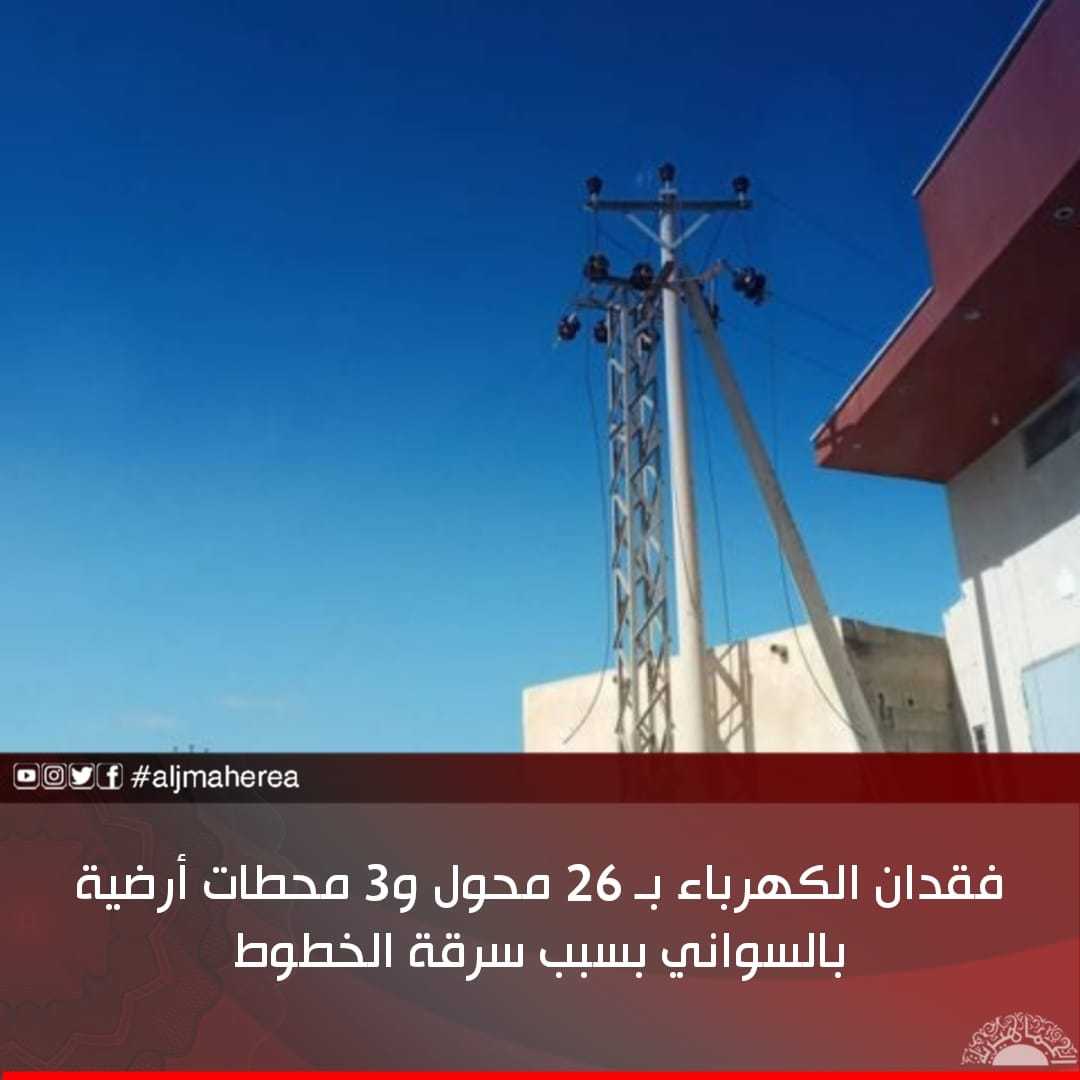 أعلنت الشركة العامة للكهرباء فقدان التغذية على حوالي 26 محول و عدد 3 محطات أرضية بدائرة توزيع السواني التابعة إلى توزيع الجفارة .