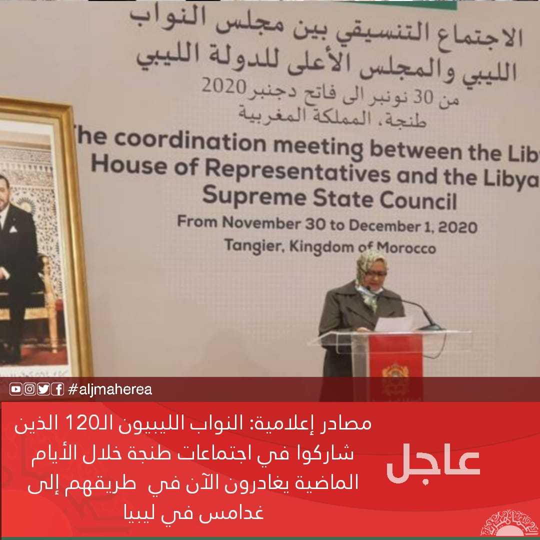عاجل// مصادر إعلامية: النواب الليبيون الـ120 الذين شاركوا في اجتماعات طنجة خلال الأيام الماضية يغادرون الآن في  طريقهم إلى غدامس في ليبيا