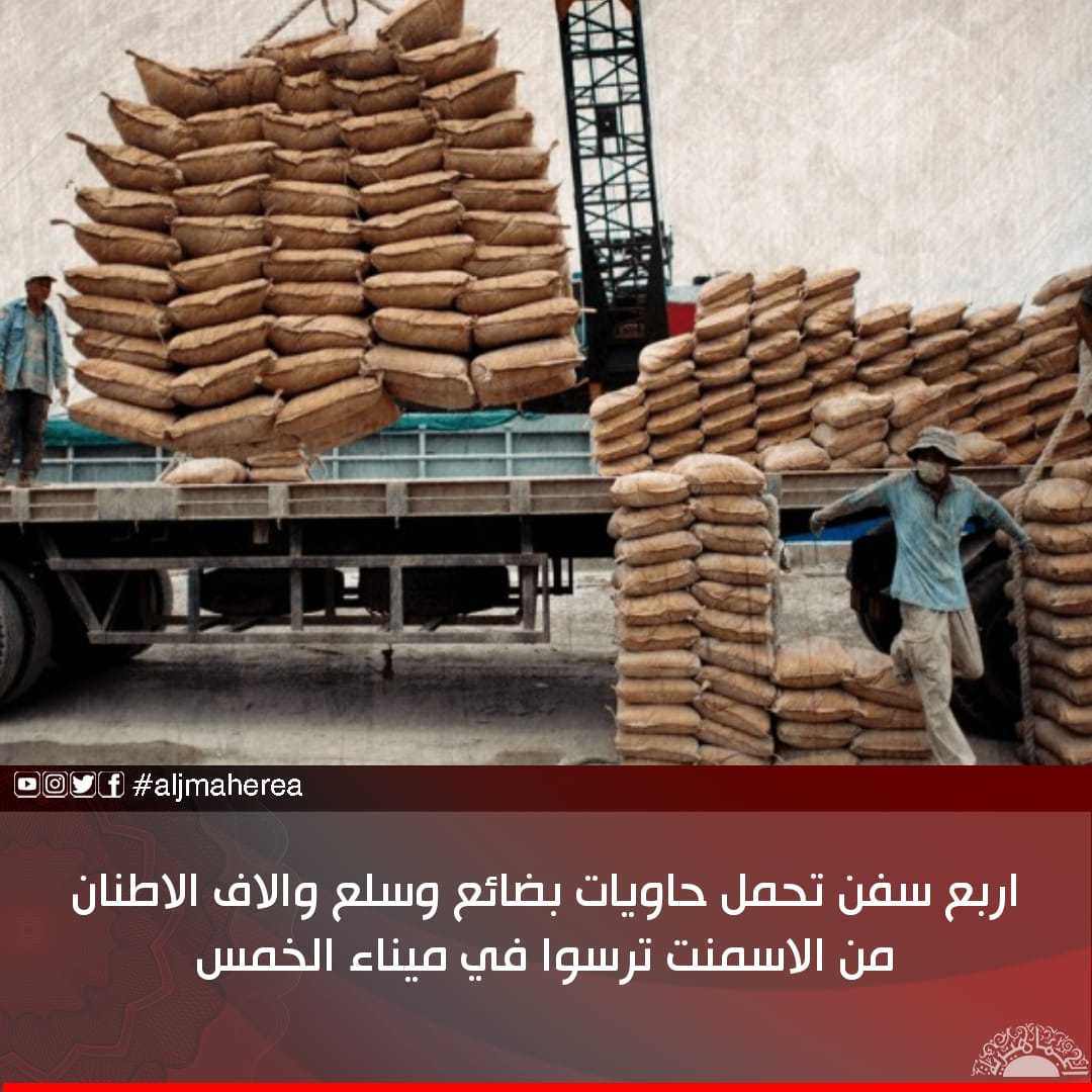 اربع سفن تحمل حاويات بضائع وسلع والاف الاطنان من الاسمنت ترسوا في ميناء الخمس