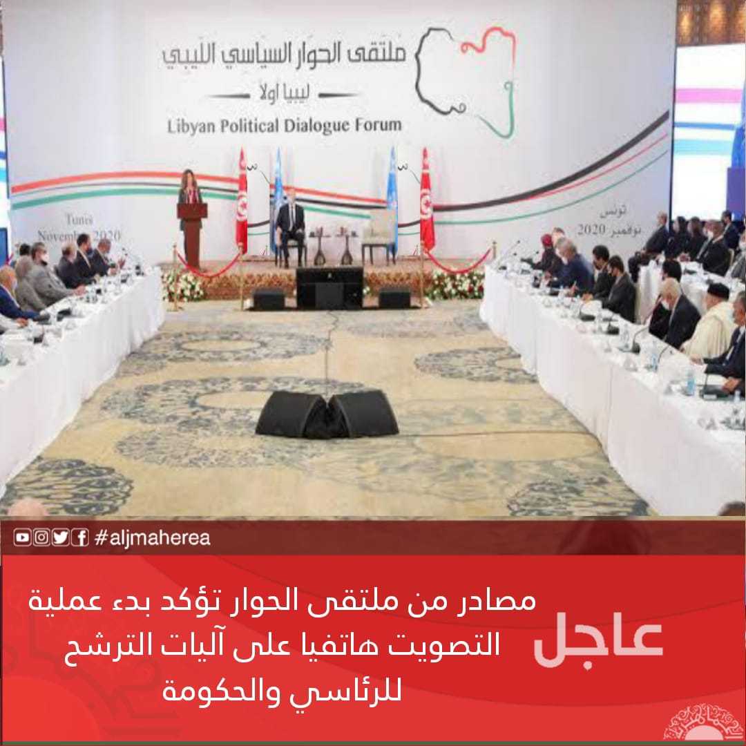 عاجل// مصادر من ملتقى الحوار تؤكد بدء عملية التصويت هاتفيا على آليات الترشح للرئاسي والحكومة 5 سنوات ago عاجل// مصادر من ملتقى الحوار تؤكد بدء عملية التصويت هاتفيا على آليات الترشح للرئاسي والحكومة مقالات ذات صلة 3 مسارات رئيسية.. بن شرادة: لقاء مرتقب بين عقيلة وتكالة لمناقشة خارطة الطريق الأممية الأرصاد يتوقع طقسًا ساخنًا اليوم وغدًا وانخفاضًا لاحقًا بدرجات الحرارة حراك ليبيا الوطن يطالب بقرارات أممية لإنهاء الانقسام