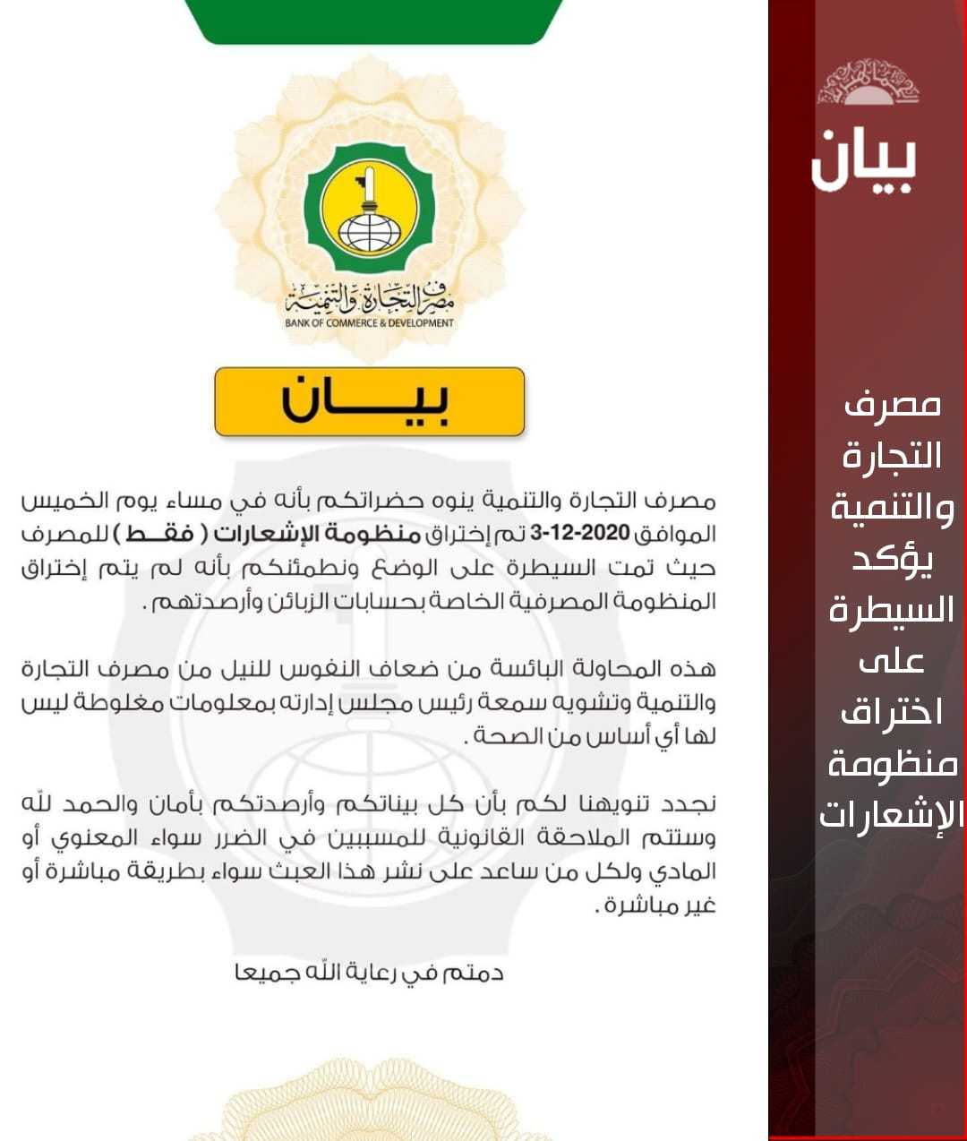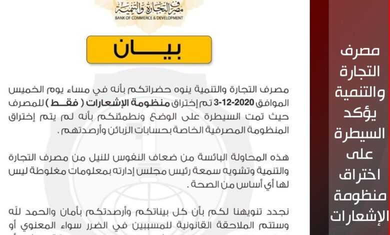مصرف التجارة والتنمية يؤكد السيطرة على اختراق منظومة الإشعارات