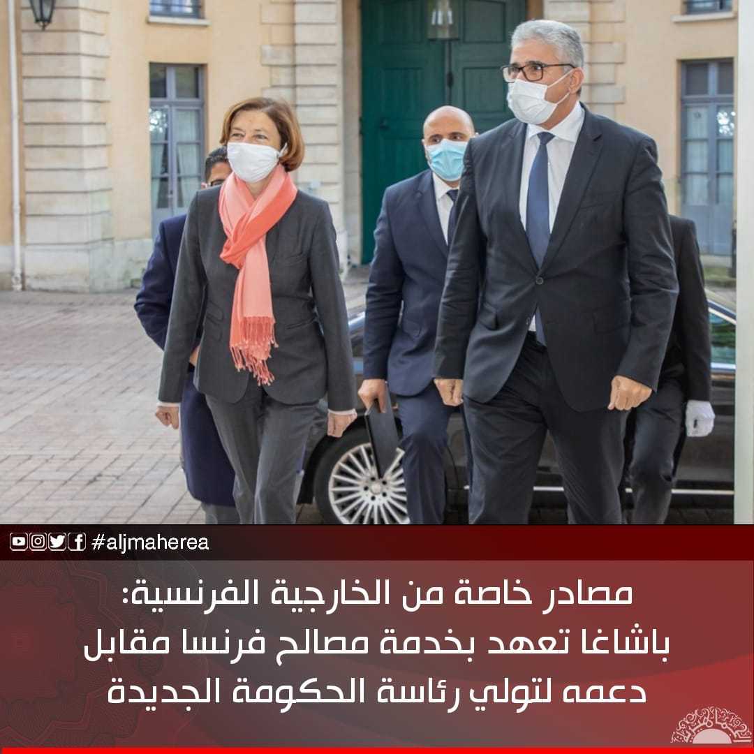 واوضحت المصادر أن باشاغا التقى بول سولير المستشار السابق للرئيس الفرنسي في الشؤون الليبية إضافة إلى وزراء الدفاع و الخارجية و الداخلية الفرنسيين ، مؤكدة أن باشاغا تعهد بأن يخدم مصالح فرنسا مقابل دعمه ليكون رئيس الوزراء في الحكومة الجديدة.