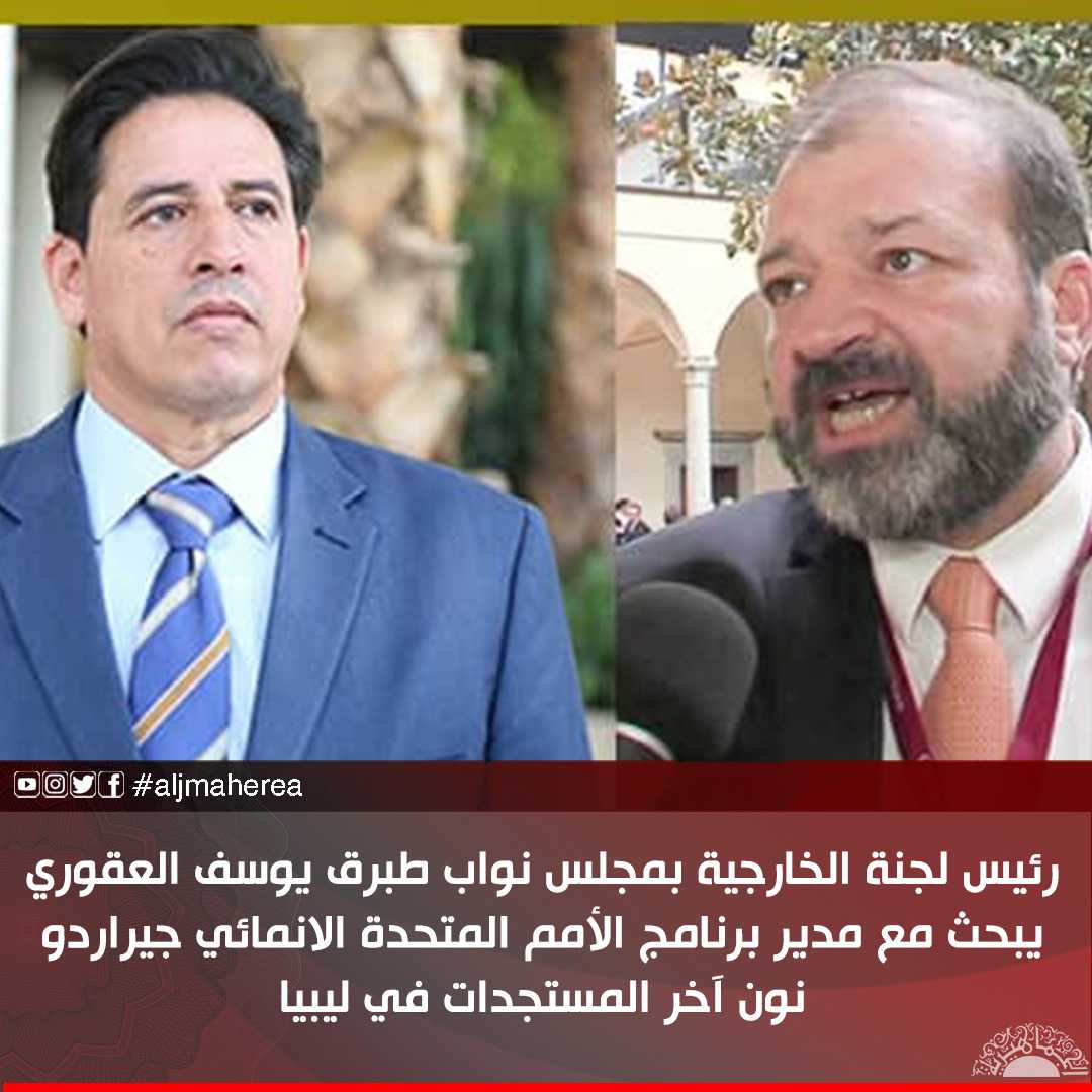 بحث رئيس لجنة الخارجية بمجلس نواب طبرق يوسف العقوري، مع مدير برنامج الأمم المتحدة الانمائي التابع للأمم المتحدة في ليبيا جيراردو نون، آخر المستجدات في ليبيا.