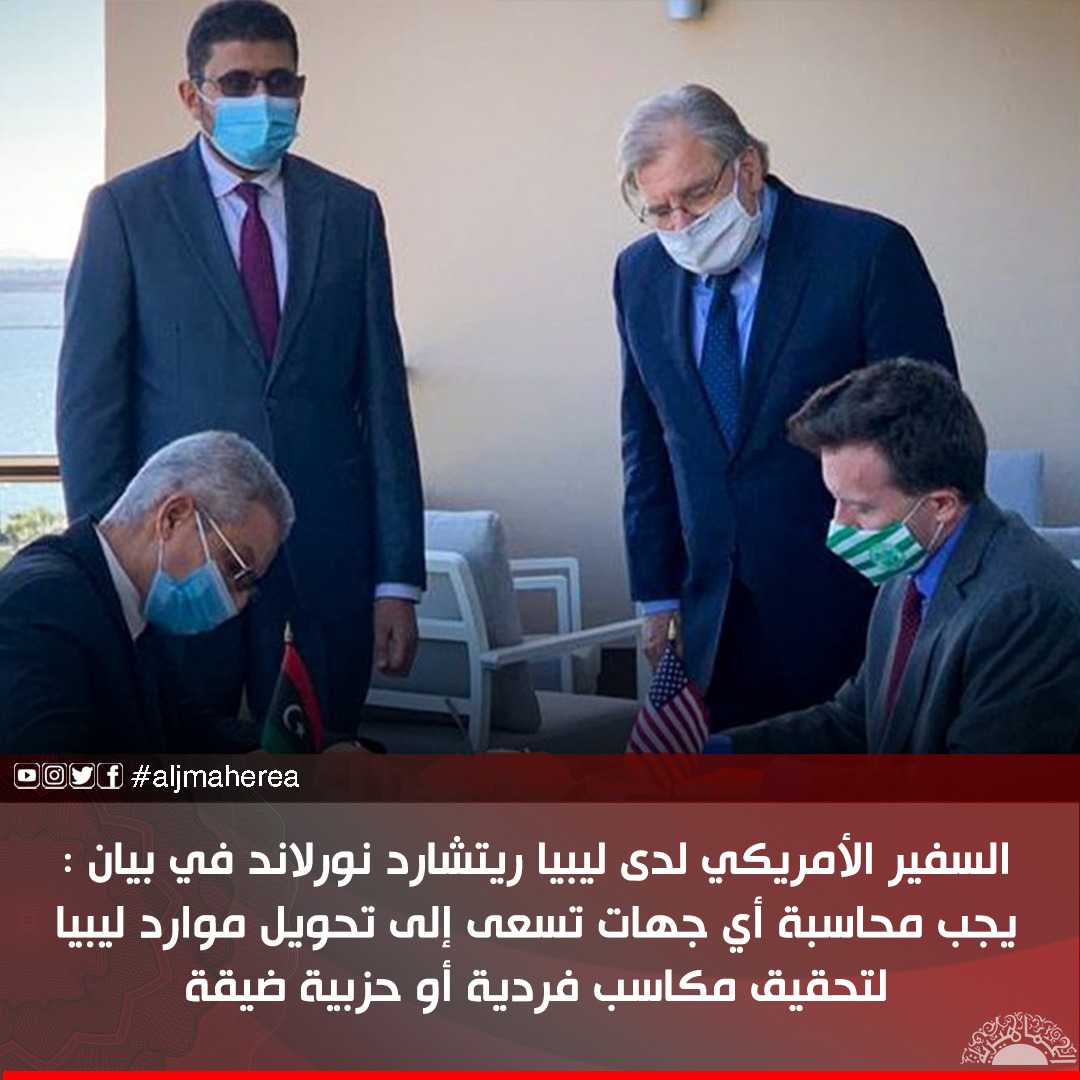 السفير الأمريكي لدى ليبيا ريتشارد نورلاند في بيان : يجب محاسبة أي جهات تسعى إلى تحويل موارد ليبيا لتحقيق مكاسب فردية أو حزبية ضيقة