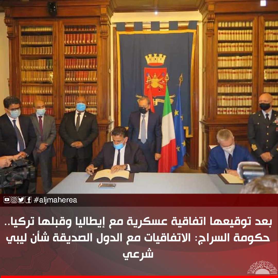 كانت وزارة الدفاع بحكومة السراج قد أعلنت، اليوم الجمعة، عن توقيع اتفاقية تعاون عسكري مشترك مع نظيرتها الإيطالية، في مختلف المجالات العسكرية.